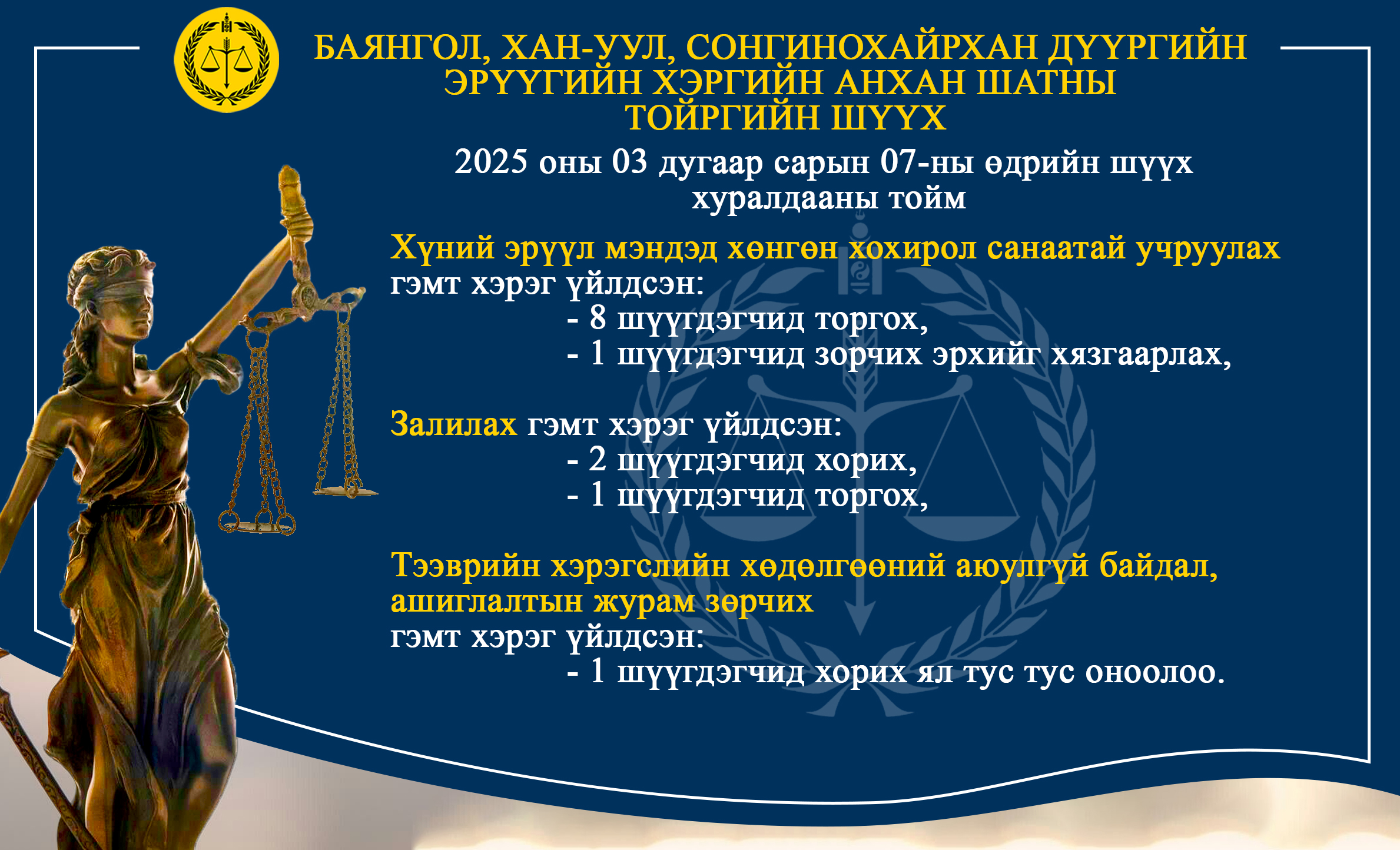 БАЯНГОЛ, ХАН-УУЛ, СОНГИНОХАЙРХАН ДҮҮРГИЙН ЭРҮҮГИЙН ХЭРГИЙН АНХАН ШАТНЫ ТОЙРГИЙН ШҮҮХ ТОЙМ /2025.03.06-2025.03.07/