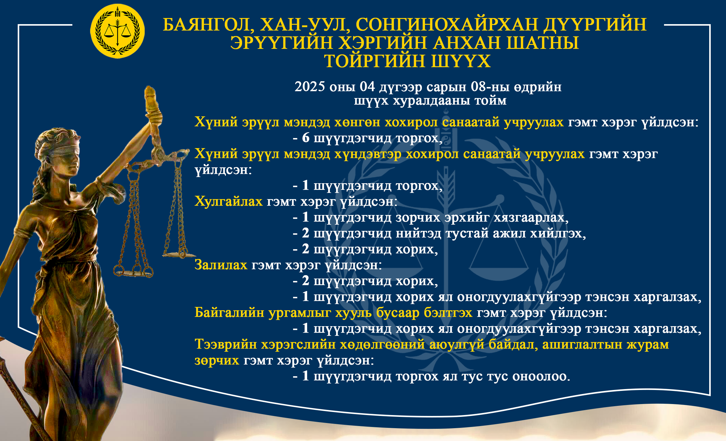 - БАЯНГОЛ, ХАН-УУЛ, СОНГИНОХАЙРХАН ДҮҮРГИЙН ЭРҮҮГИЙН ХЭРГИЙН АНХАН ШАТНЫ ТОЙРГИЙН ШҮҮХ ТОЙМ /2025.04.07-2025.04.10/