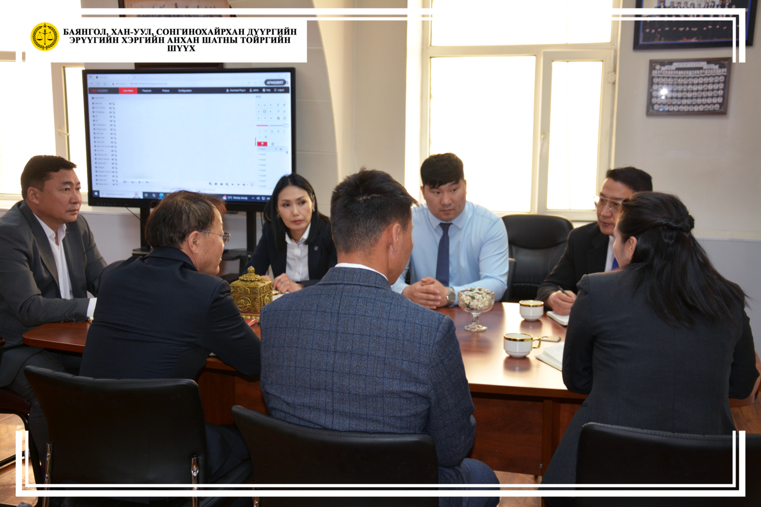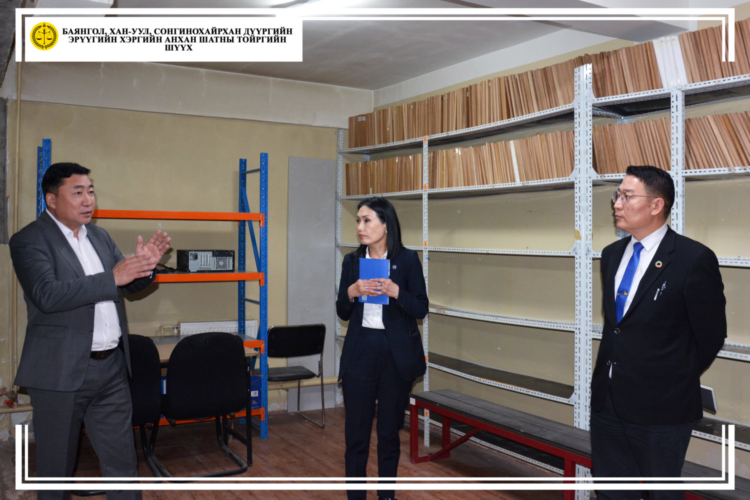 Тус шүүхийн Тамгын газрын дарга М.Нямсүрэн "Шүүхийн архивын үйл ажиллагаа, архивын хадгаламжийн сангийн данс бүртгэл, орчин нөхцөл, хадгаламжийн нэгжийн хадгалалт, хамгаалалт"-ын талаар мэдээлэл өгч, ажлын хэсгийн гишүүд Шүүхийн Ерөнхий зөвлөлийн Захиргаа удирдлагын газрын дарга Л.Санжрагчаа, Шүүхийн тусгай архивын дарга Ш.Отгонцэцэг, Шүүхийн тусгай архивын арга зүйч Л.Өнөртуяа нар тус шүүхийн Тамгын газрын архивын үйл ажиллагаа, архивын баримтын хадгалалт, хамгаалалт, архивын өрөө тасалгаа, хадгаламжийн сангийн аюулгүй байдал хангасан эсэхтэй биечлэн танилцаж, цаашид анхаарах асуудлын талаар зөвлөгөө, мэдээлэл өгөв.