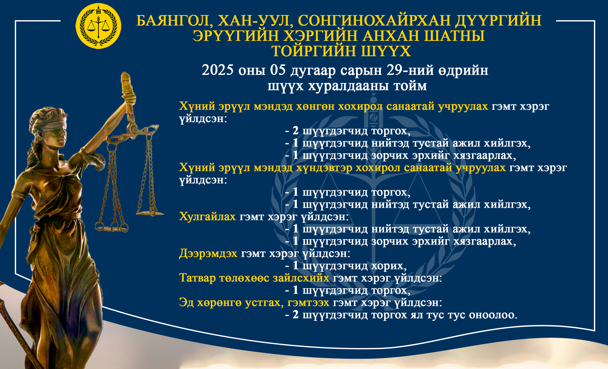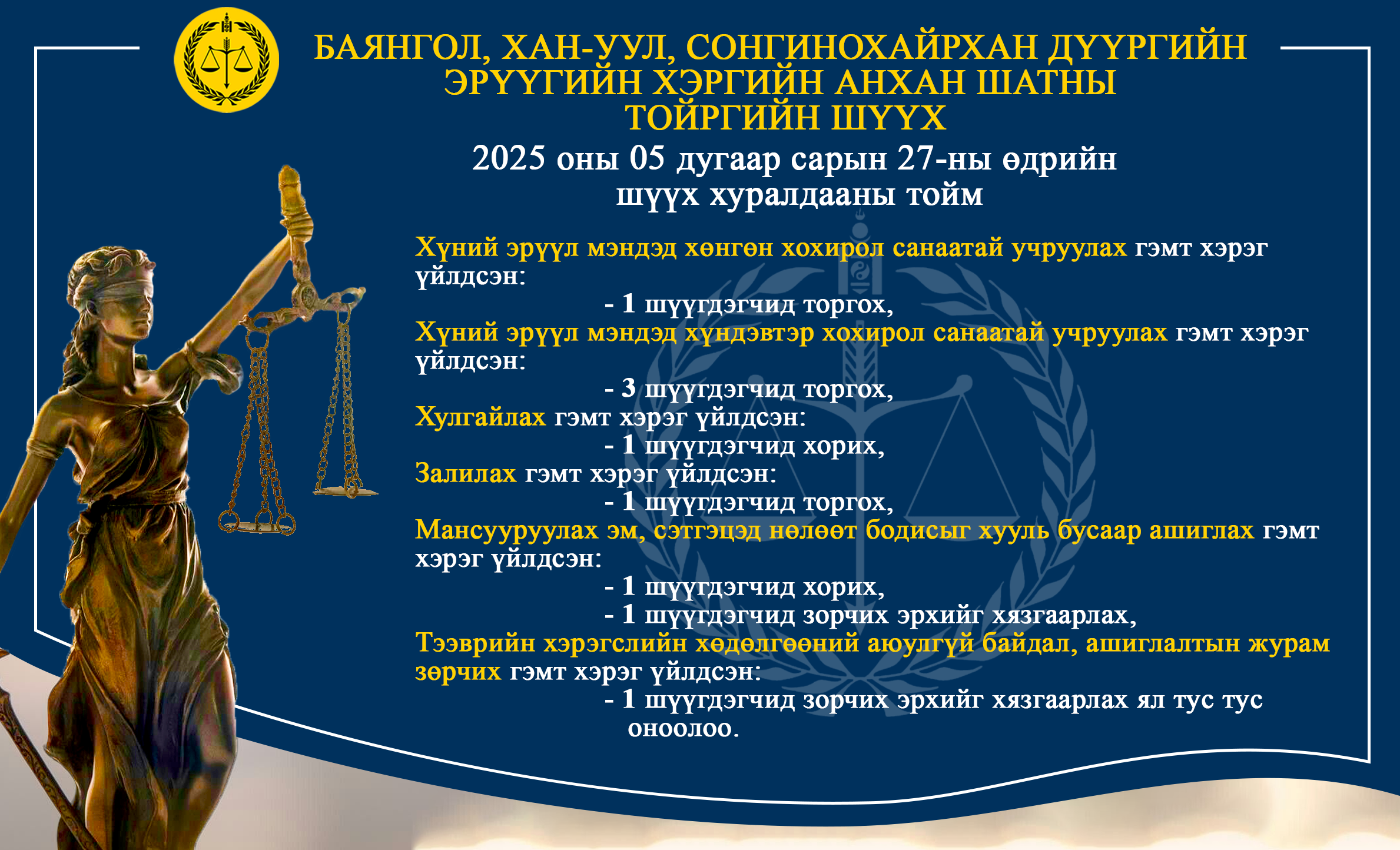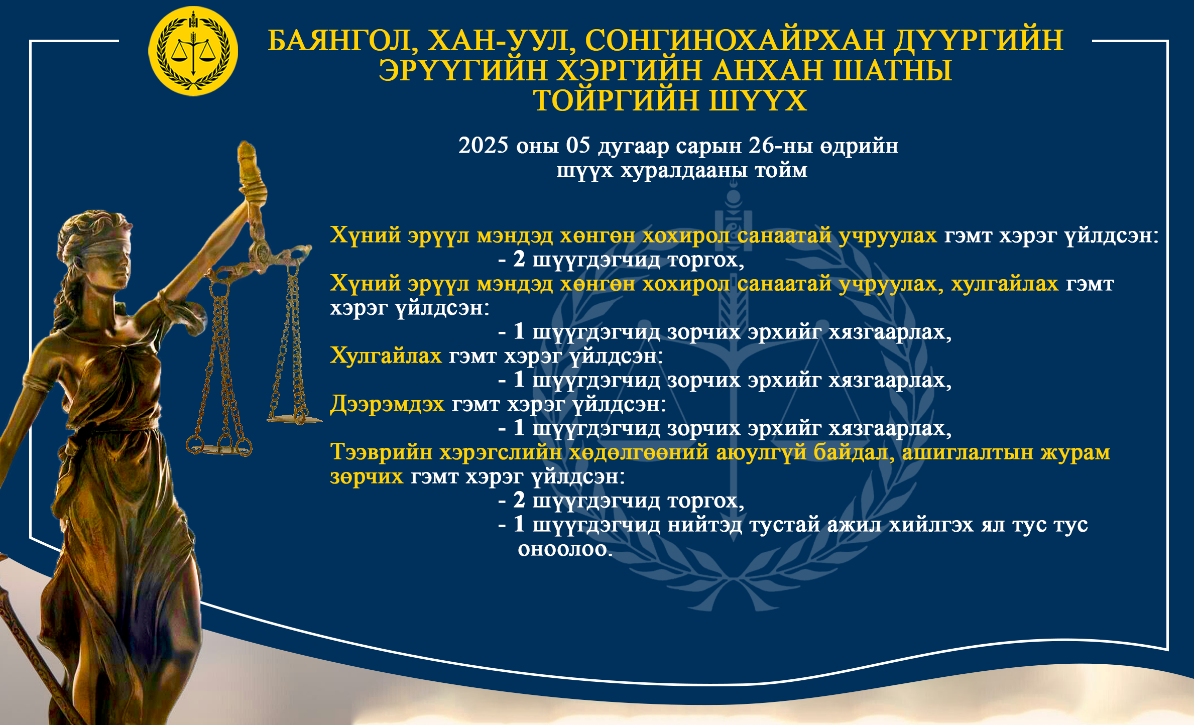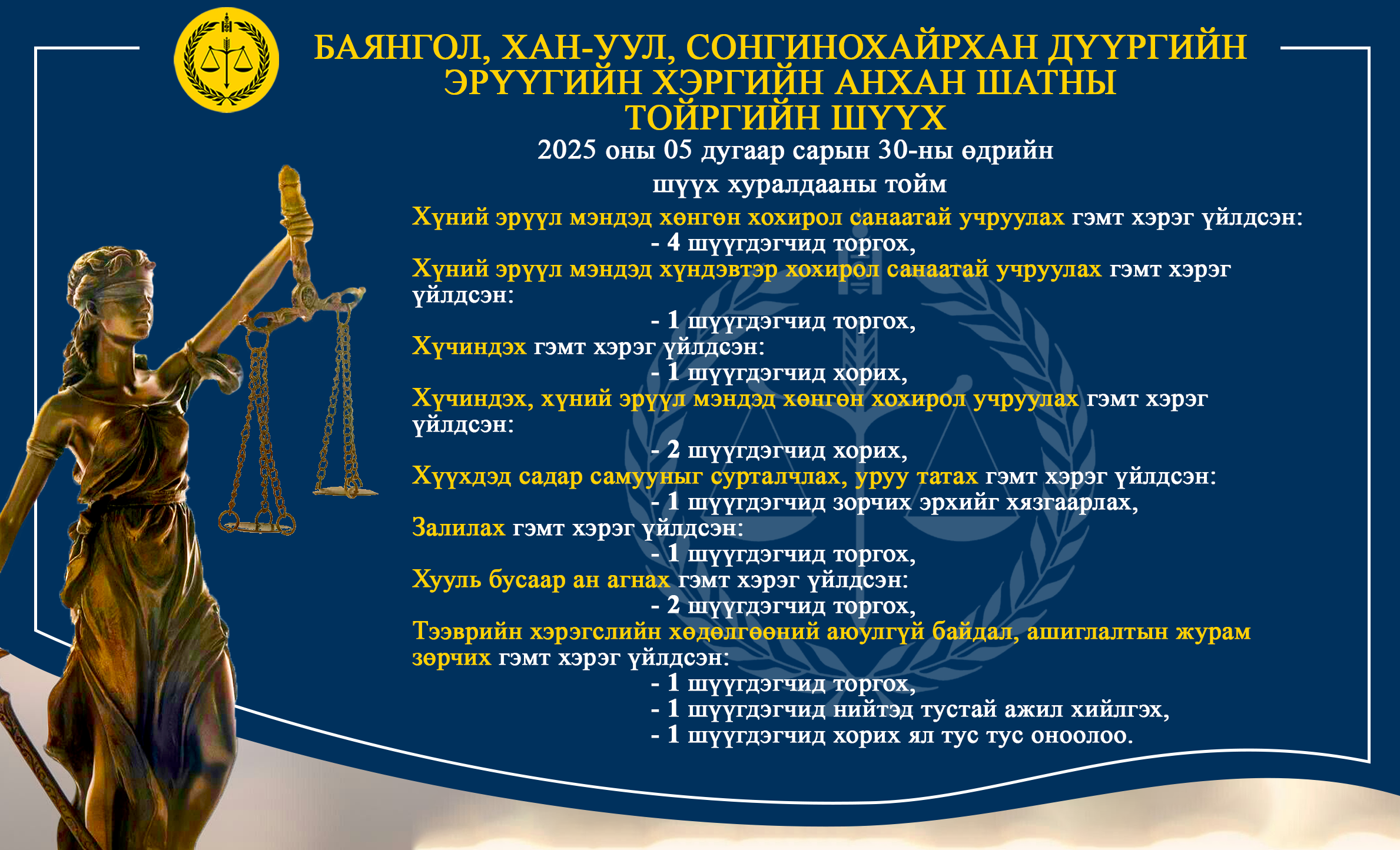 - БАЯНГОЛ, ХАН-УУЛ, СОНГИНОХАЙРХАН ДҮҮРГИЙН ЭРҮҮГИЙН ХЭРГИЙН АНХАН ШАТНЫ ТОЙРГИЙН ШҮҮХ ТОЙМ /2025.05.26-2025.05.30/