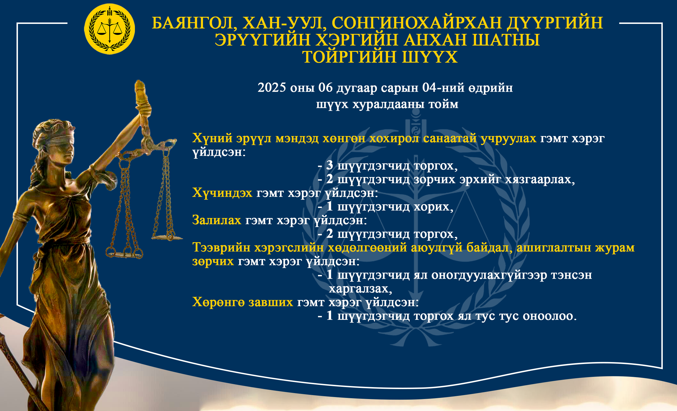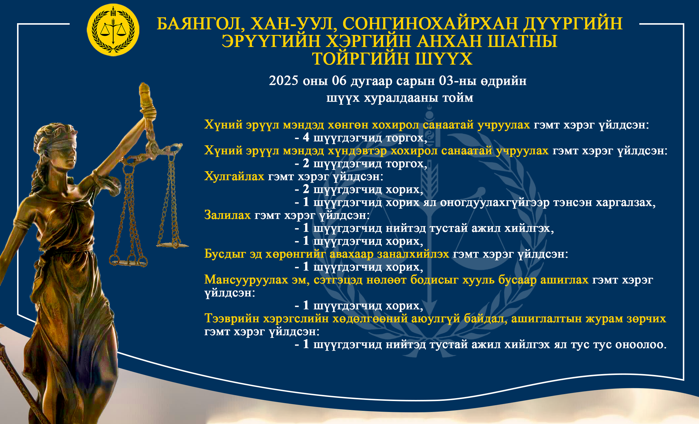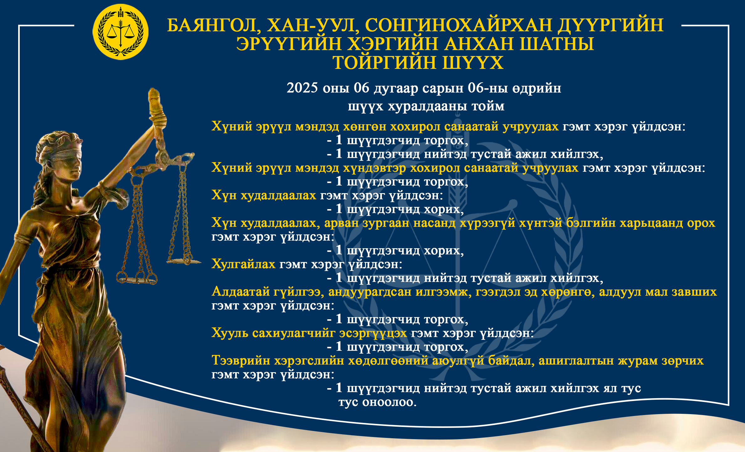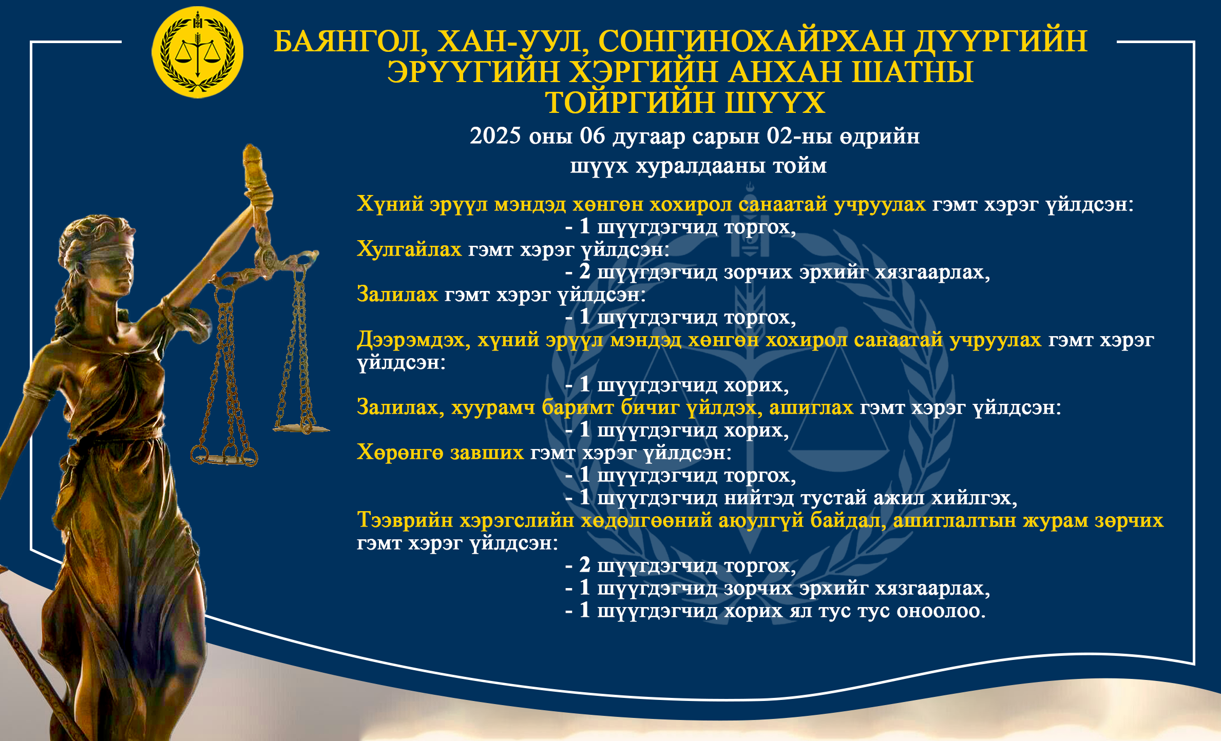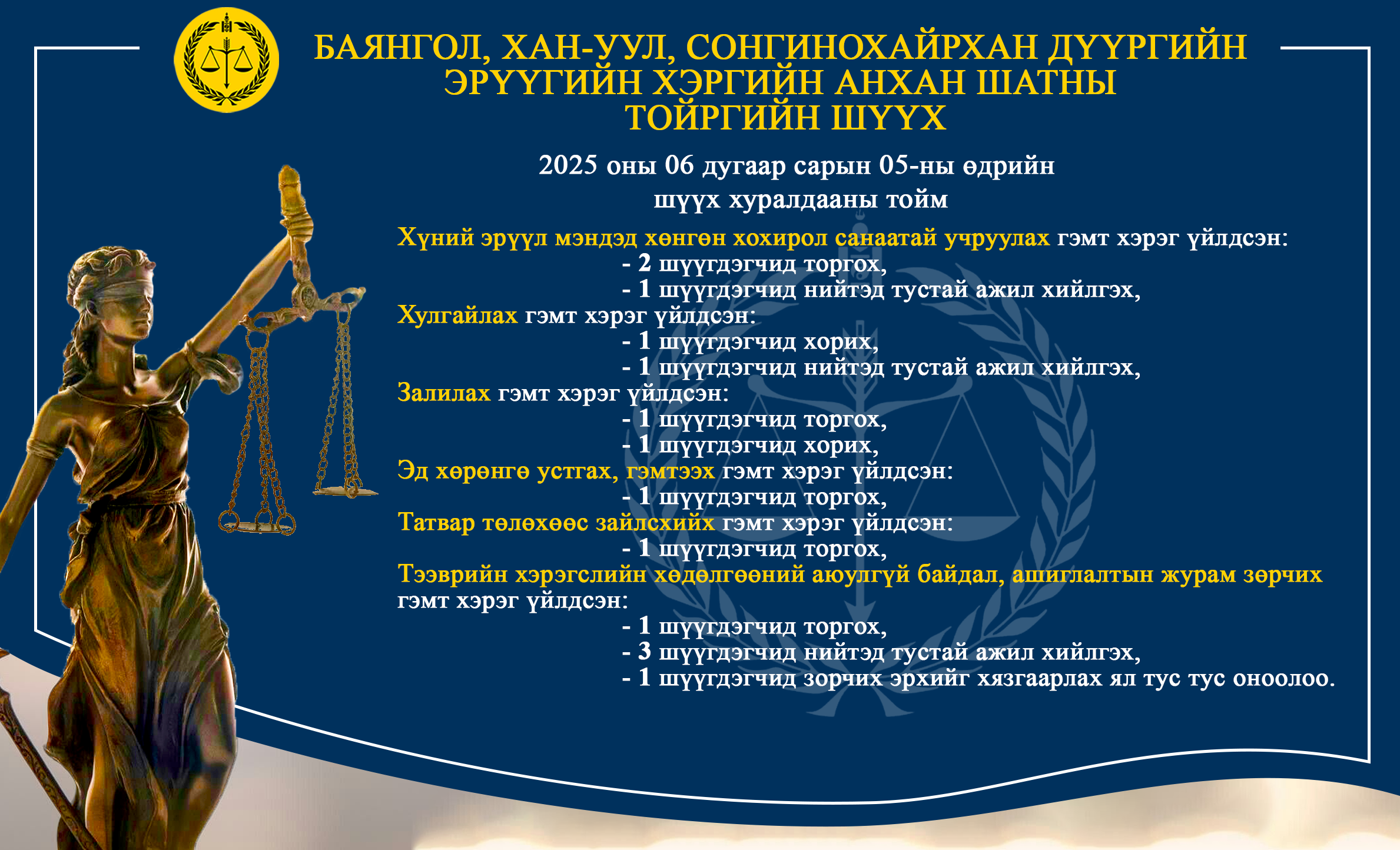 - БАЯНГОЛ, ХАН-УУЛ, СОНГИНОХАЙРХАН ДҮҮРГИЙН ЭРҮҮГИЙН ХЭРГИЙН АНХАН ШАТНЫ ТОЙРГИЙН ШҮҮХ ТОЙМ /2025.06.02-2025.06.06/