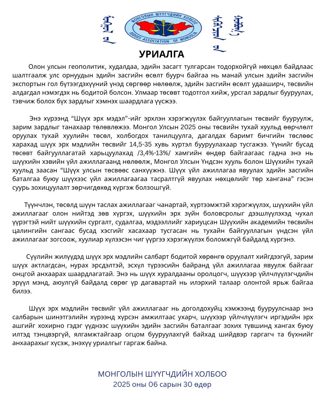 ШҮҮН ТАСЛАХ АЖИЛЛАГААНЫ МЭДЭЭ 2025 оны 11 дүгээр сарын шүүн таслах ажиллагааны мэдээг танилцуулж байна.