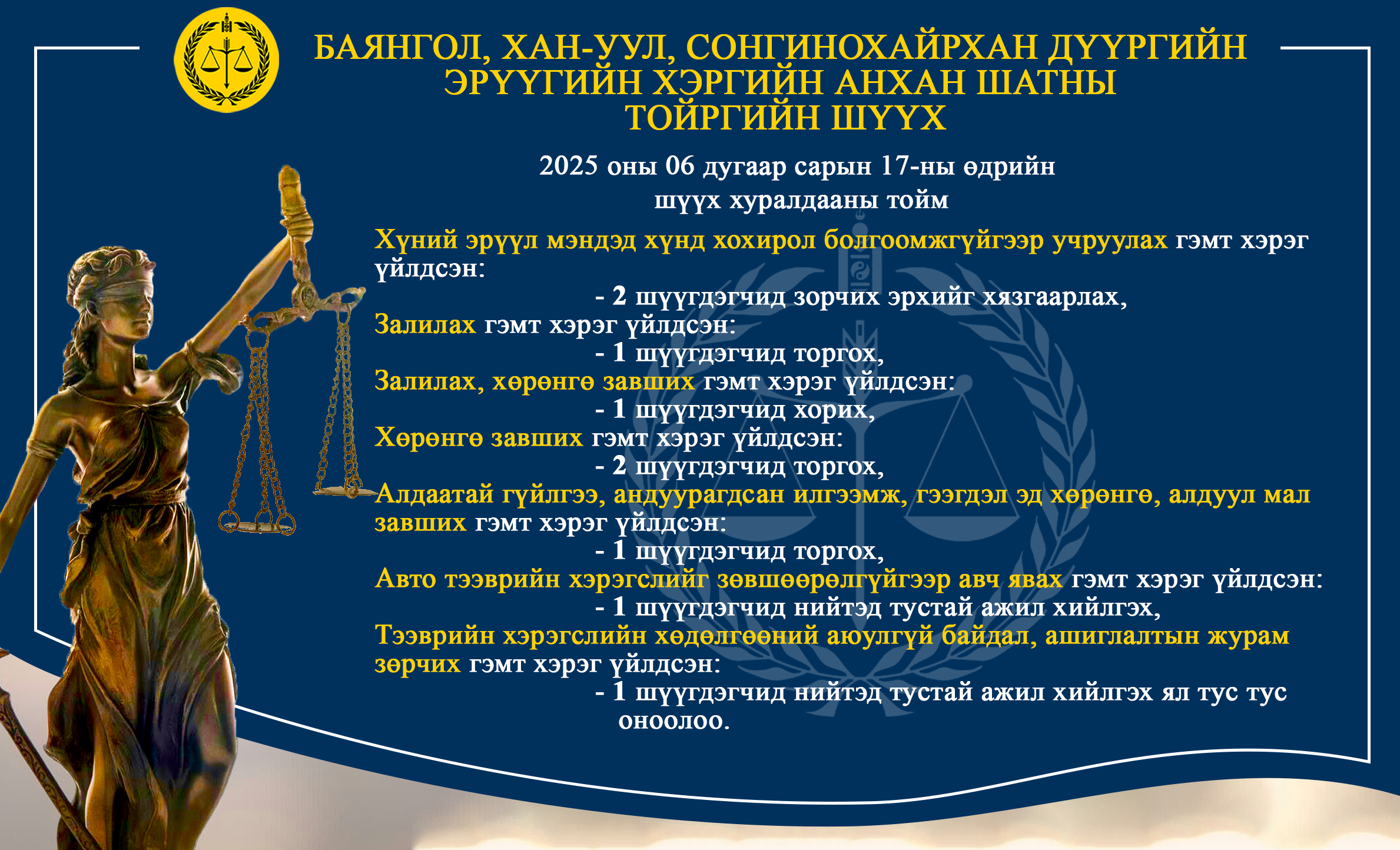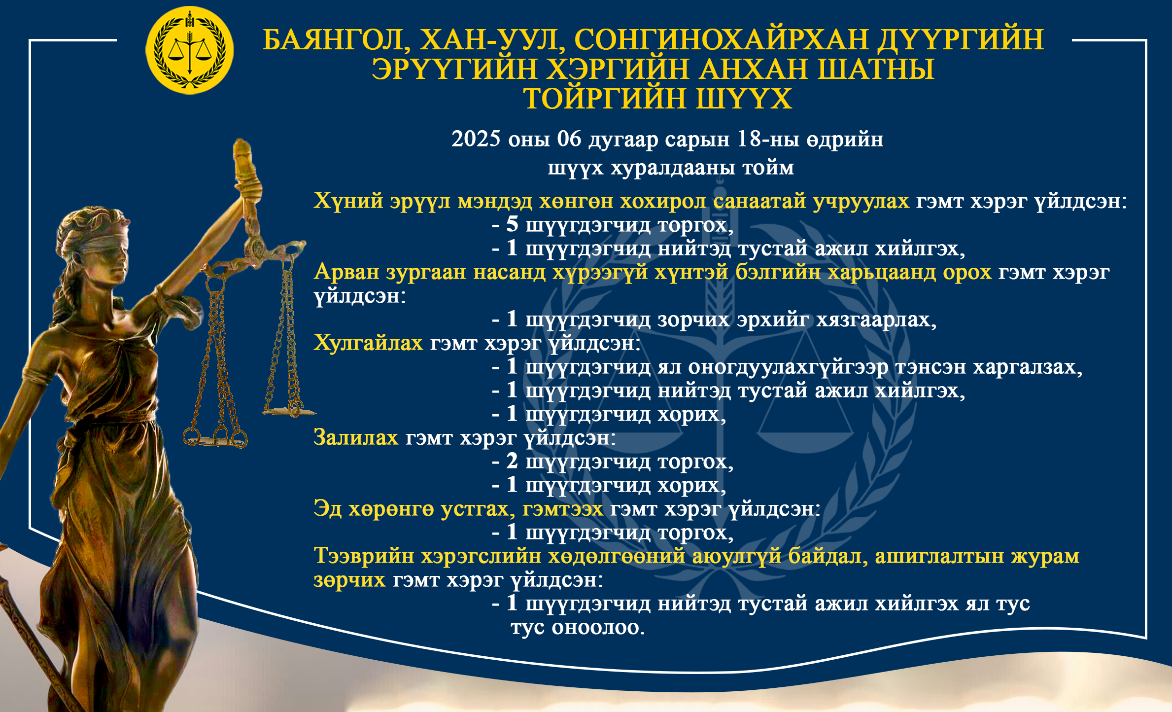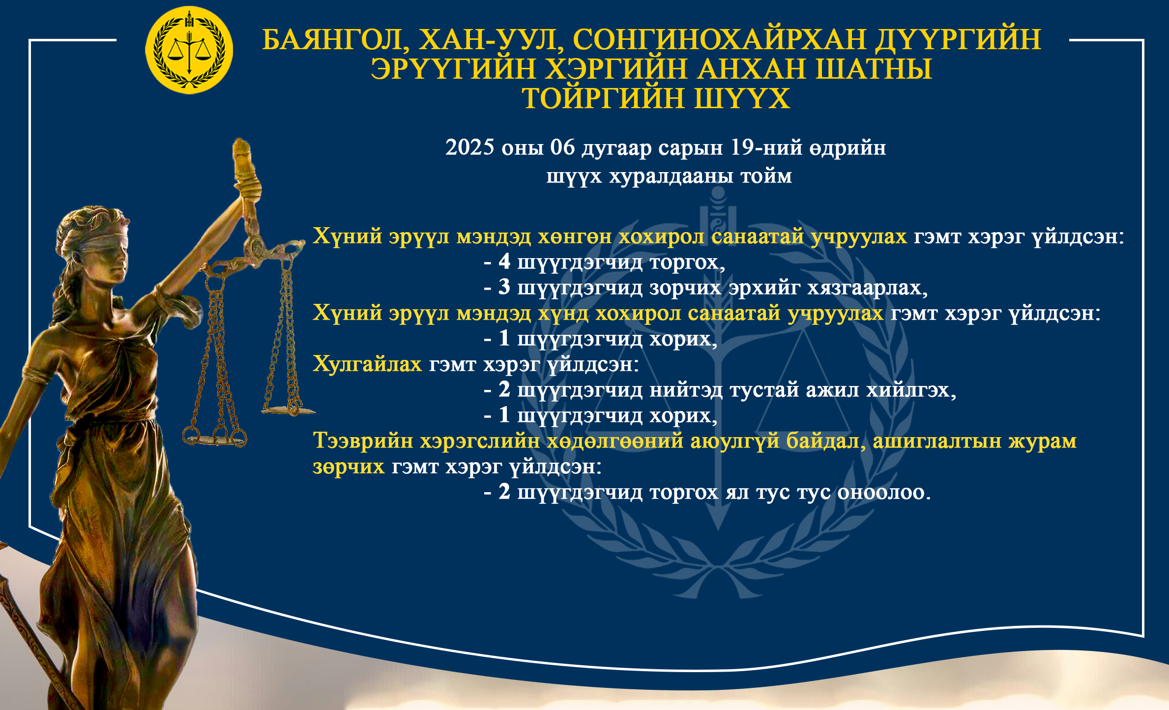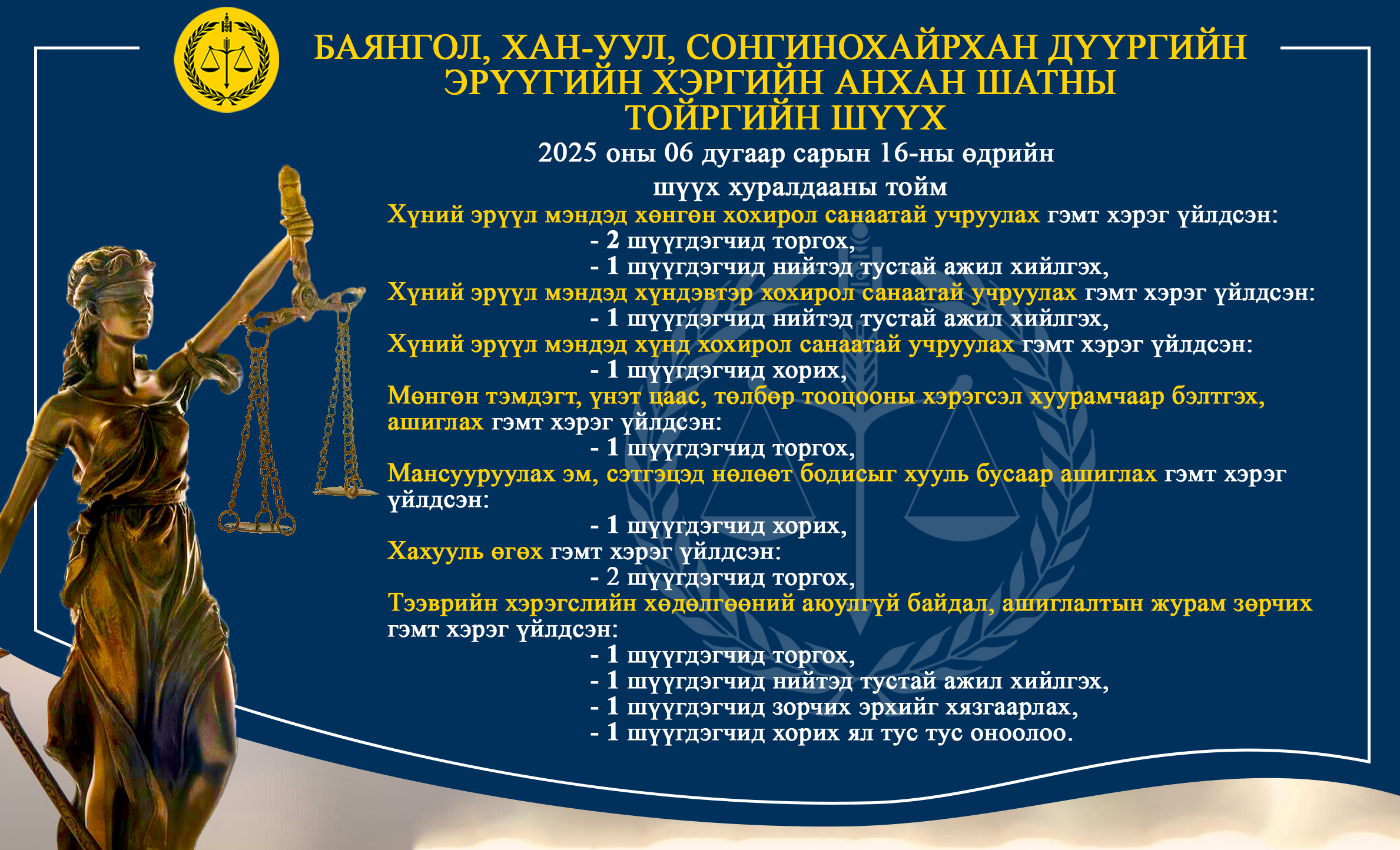 - БАЯНГОЛ, ХАН-УУЛ, СОНГИНОХАЙРХАН ДҮҮРГИЙН ЭРҮҮГИЙН ХЭРГИЙН АНХАН ШАТНЫ ТОЙРГИЙН ШҮҮХ ТОЙМ /2025.06.16-2025.06.19/