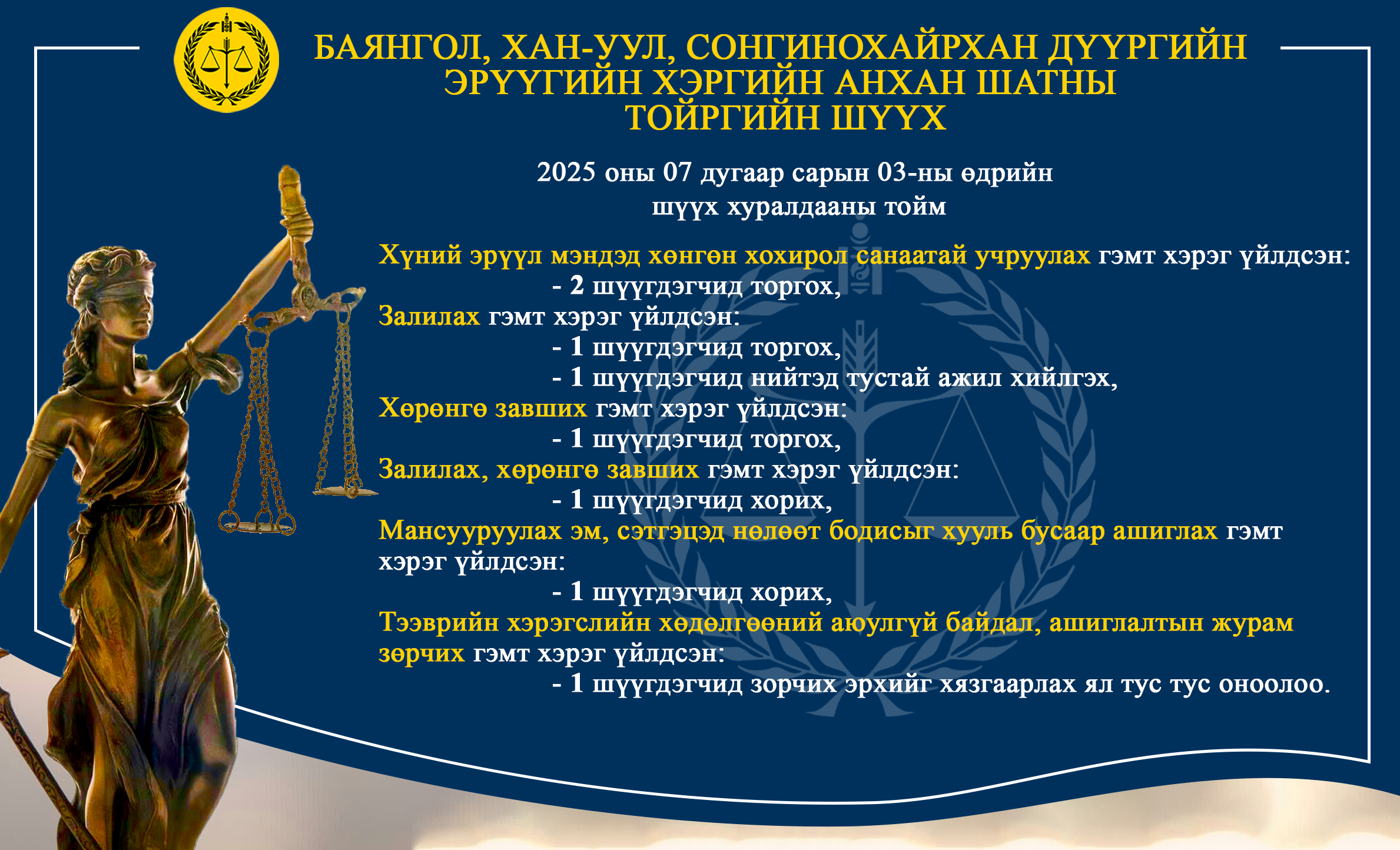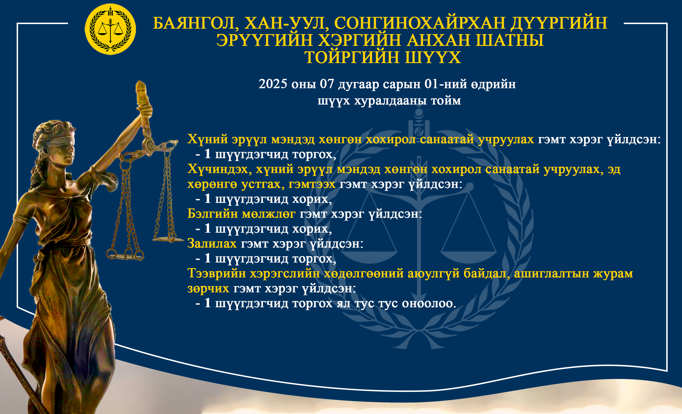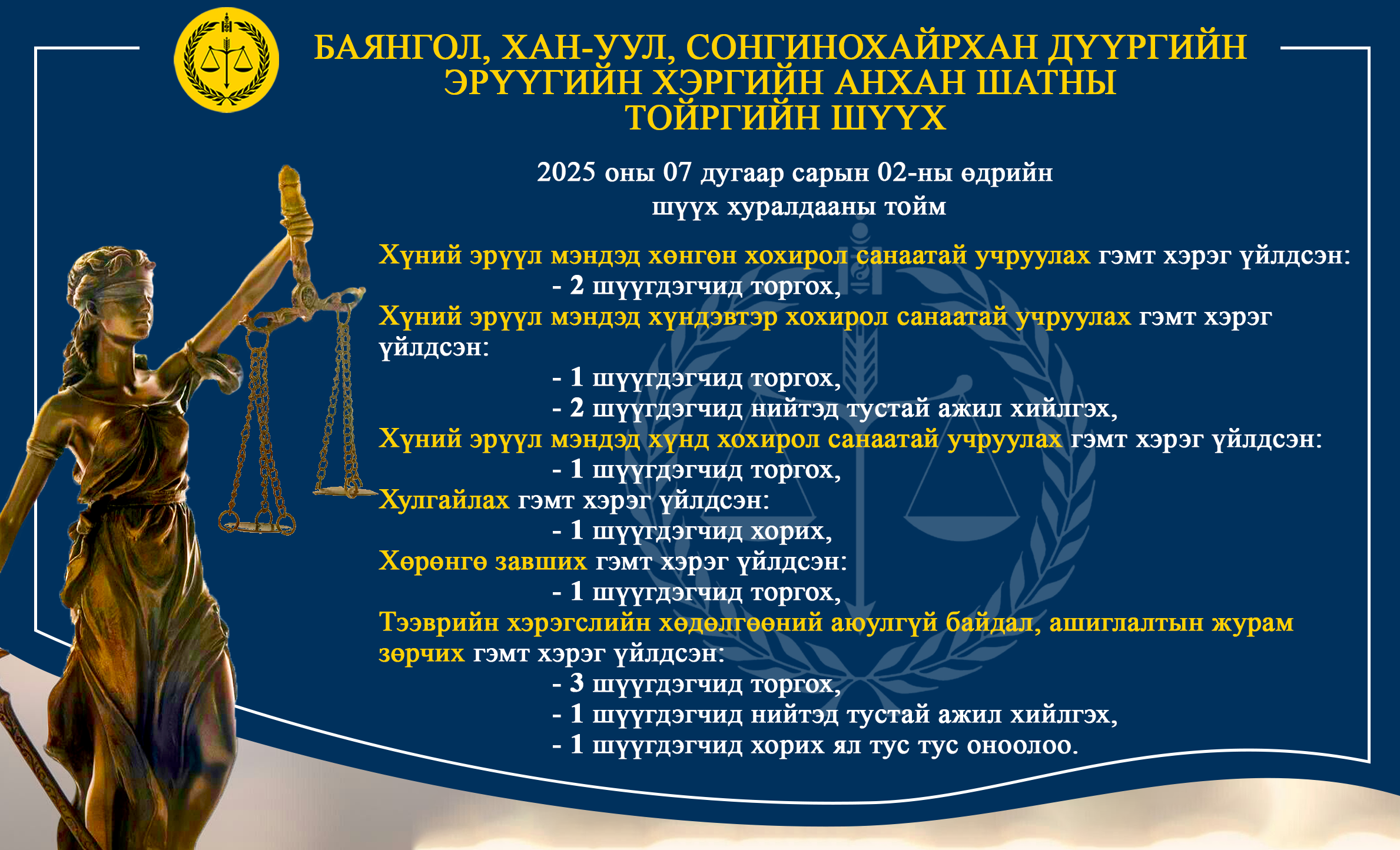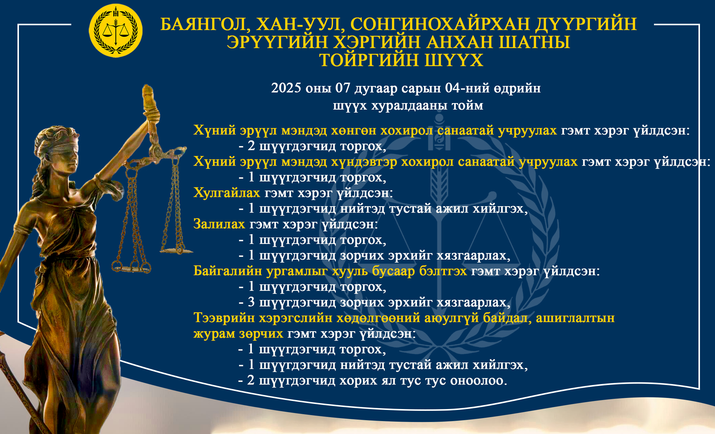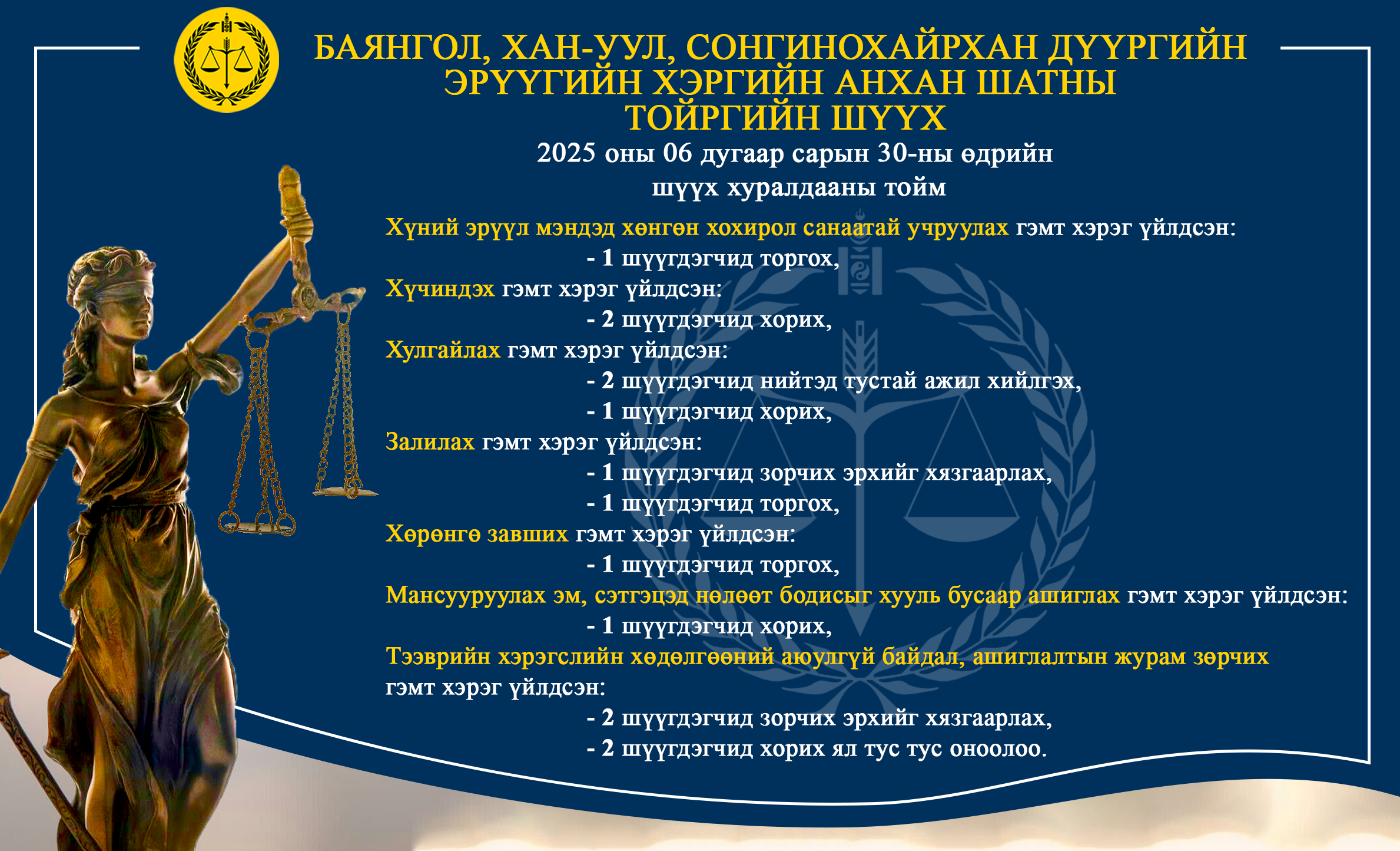 БАЯНГОЛ, ХАН-УУЛ, СОНГИНОХАЙРХАН ДҮҮРГИЙН ЭРҮҮГИЙН ХЭРГИЙН АНХАН ШАТНЫ ТОЙРГИЙН ШҮҮХ ТОЙМ /2025.06.30-2025.07.04/