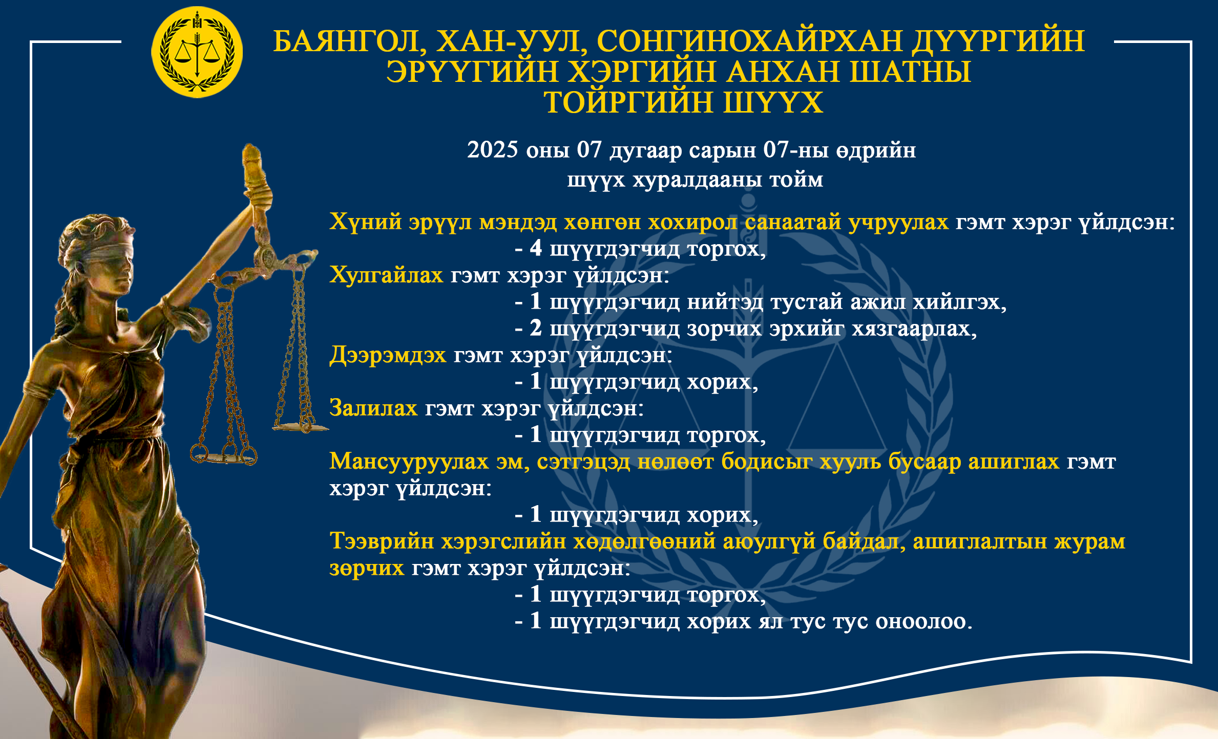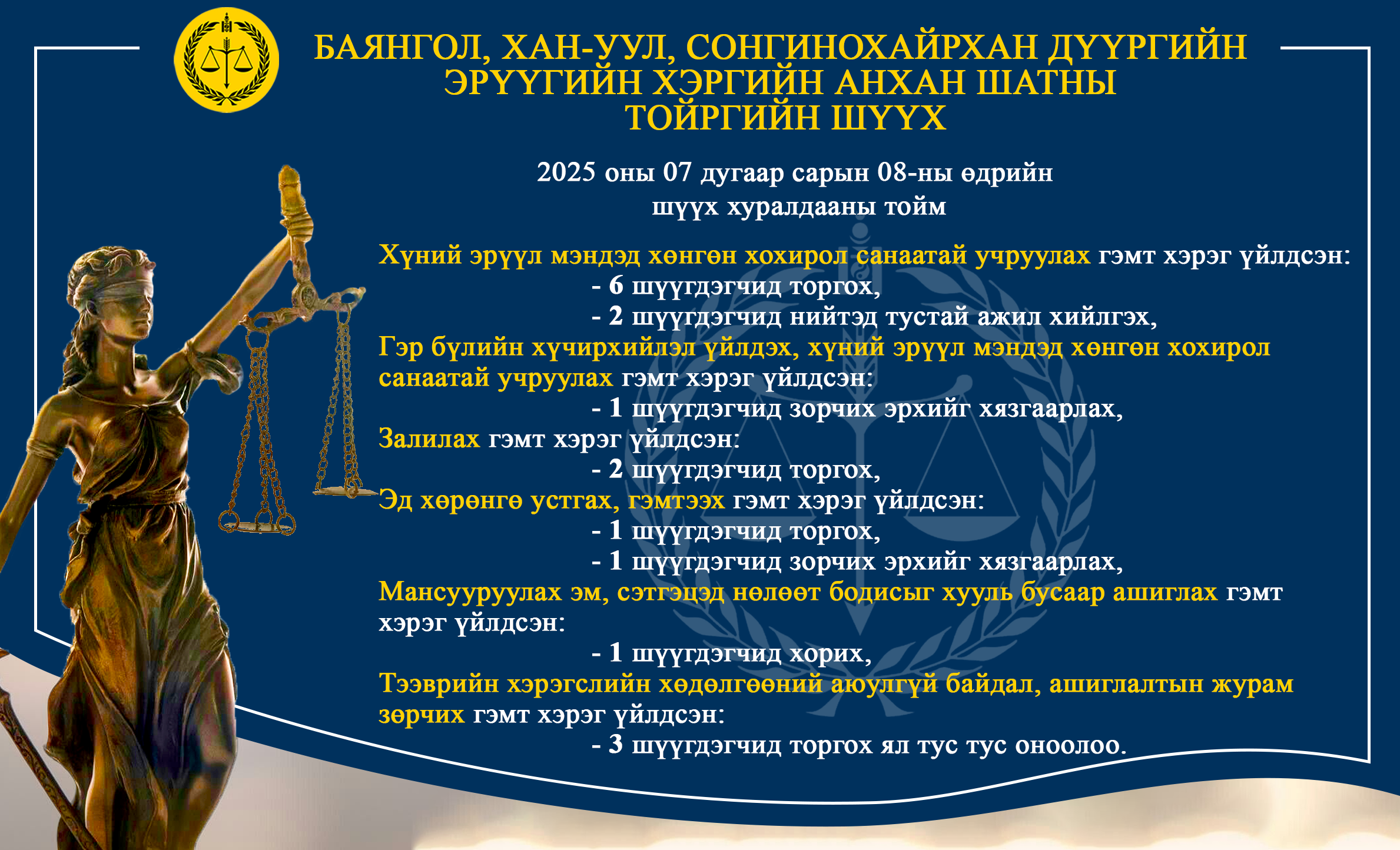 - БАЯНГОЛ, ХАН-УУЛ, СОНГИНОХАЙРХАН ДҮҮРГИЙН ЭРҮҮГИЙН ХЭРГИЙН АНХАН ШАТНЫ ТОЙРГИЙН ШҮҮХ ТОЙМ /2025.07.07-2025.07.08/