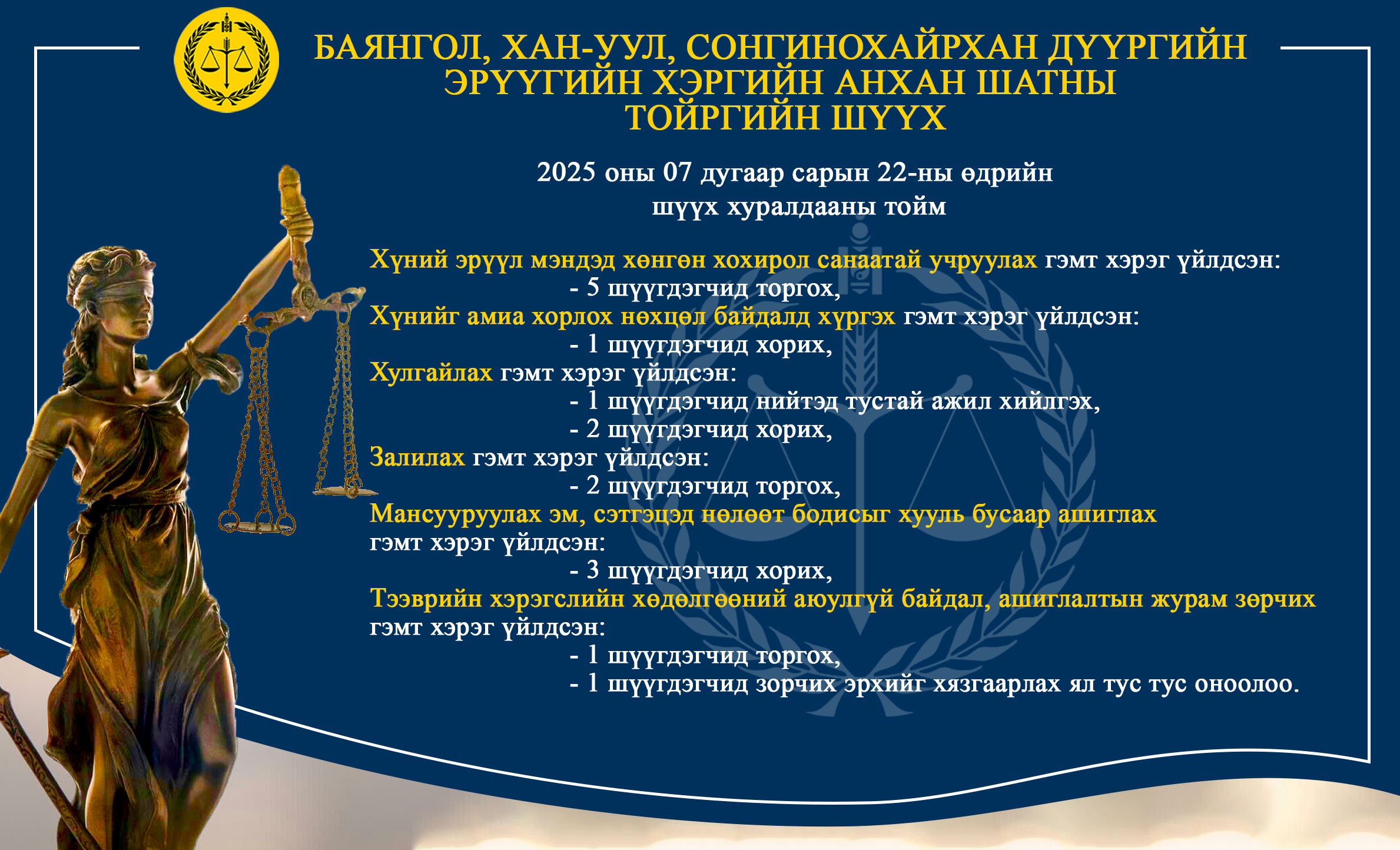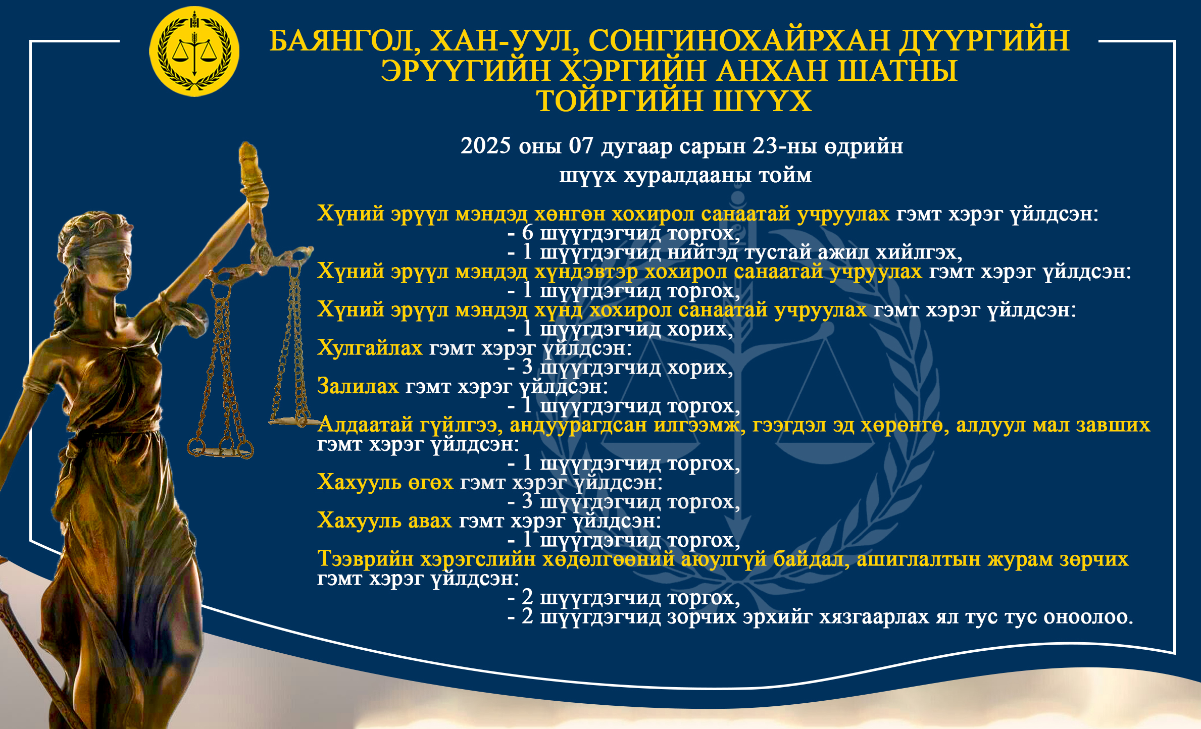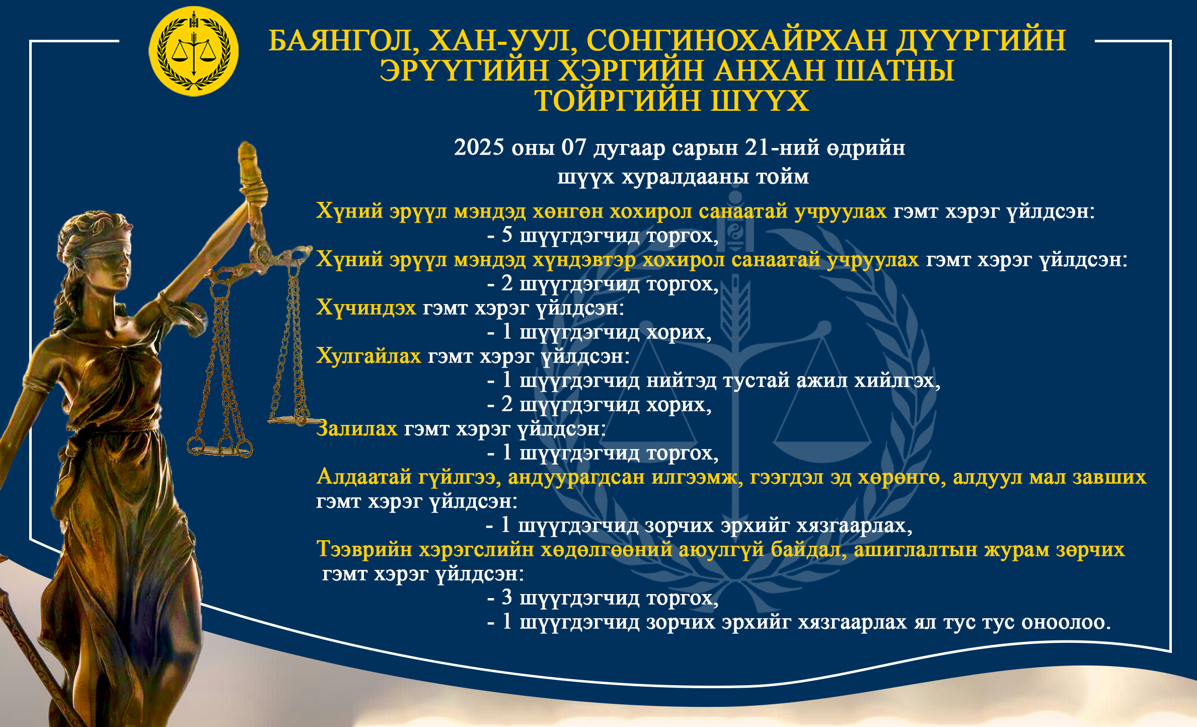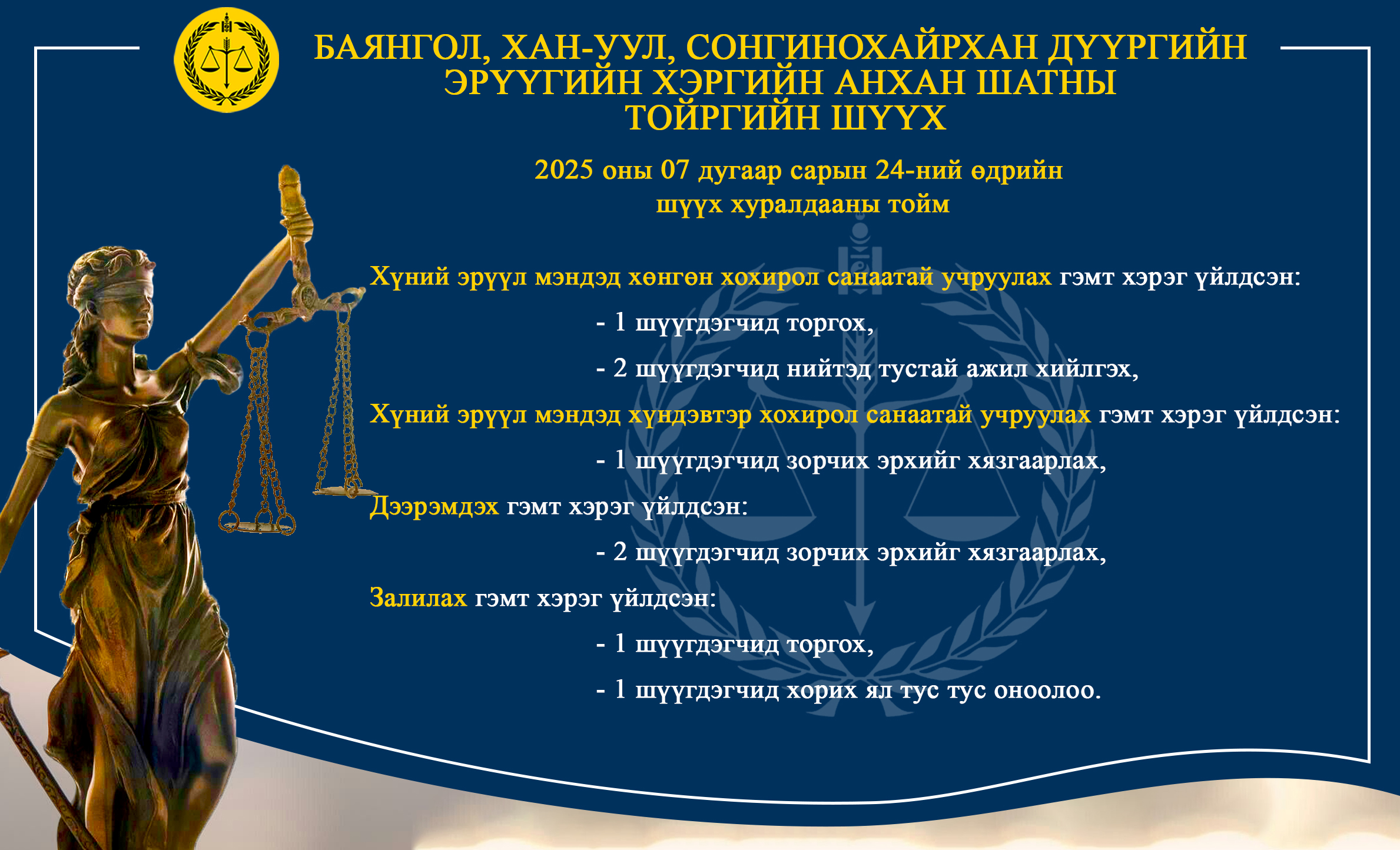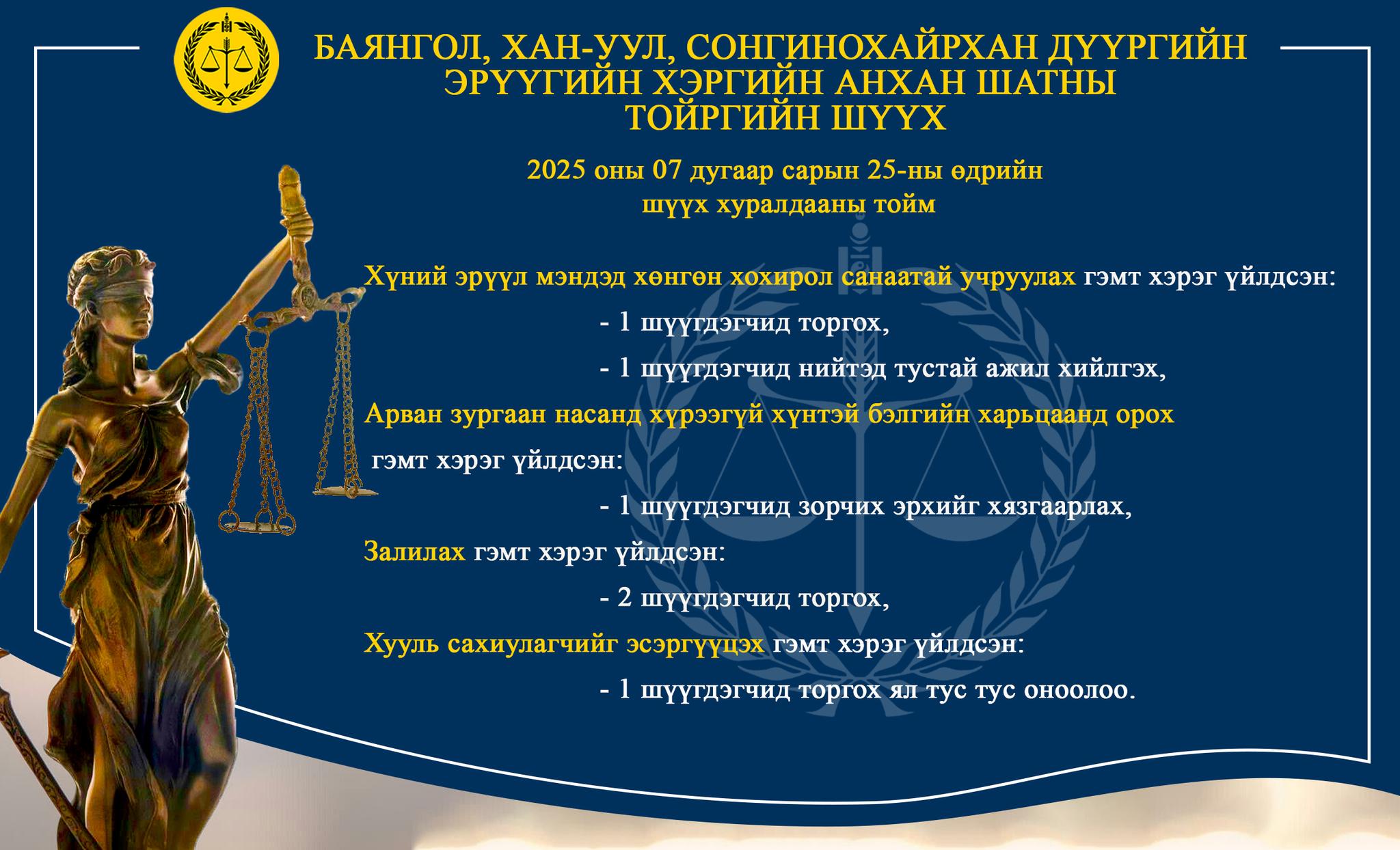 - БАЯНГОЛ, ХАН-УУЛ, СОНГИНОХАЙРХАН ДҮҮРГИЙН ЭРҮҮГИЙН ХЭРГИЙН АНХАН ШАТНЫ ТОЙРГИЙН ШҮҮХ ТОЙМ /2025.07.21-2025.07.25/