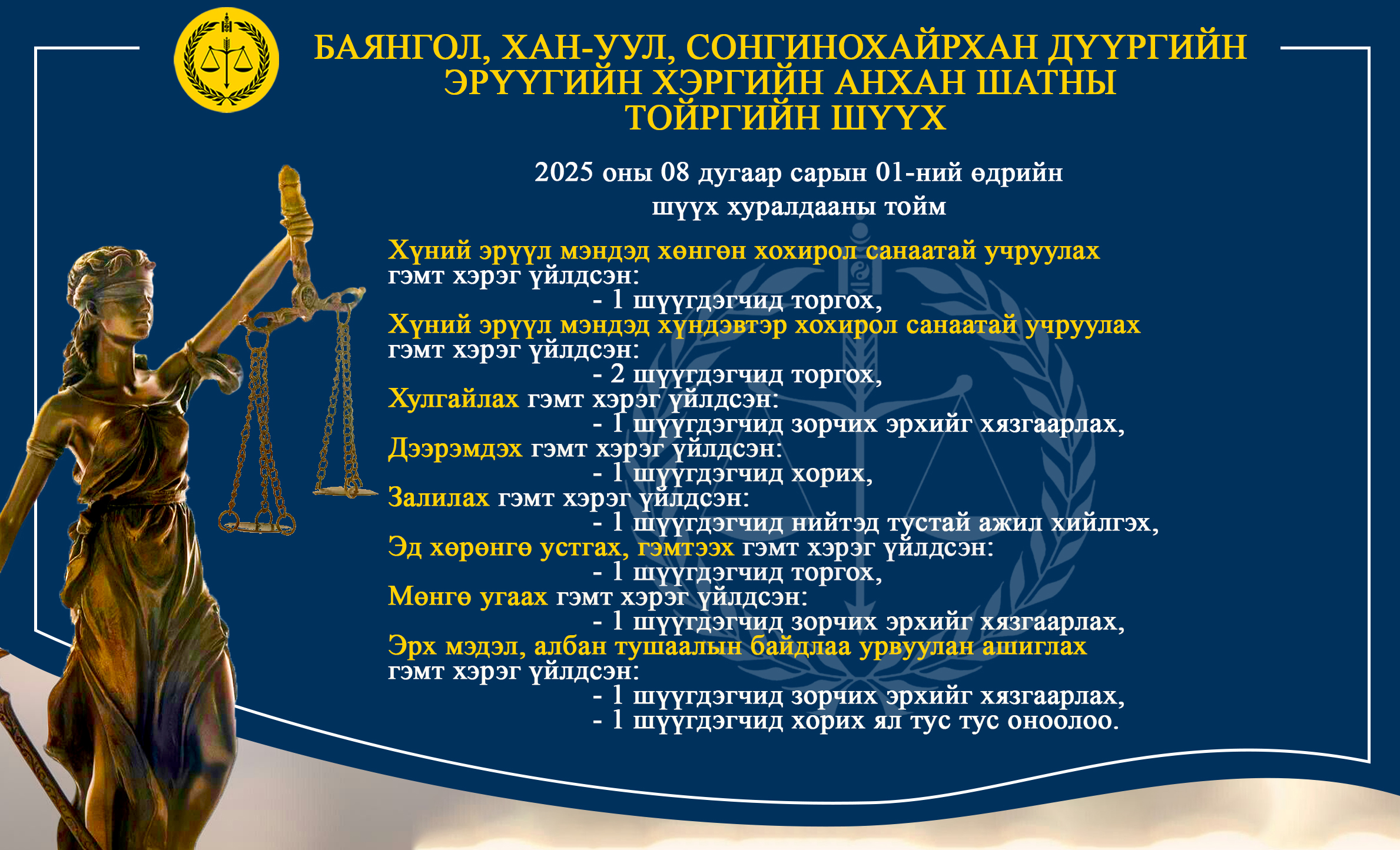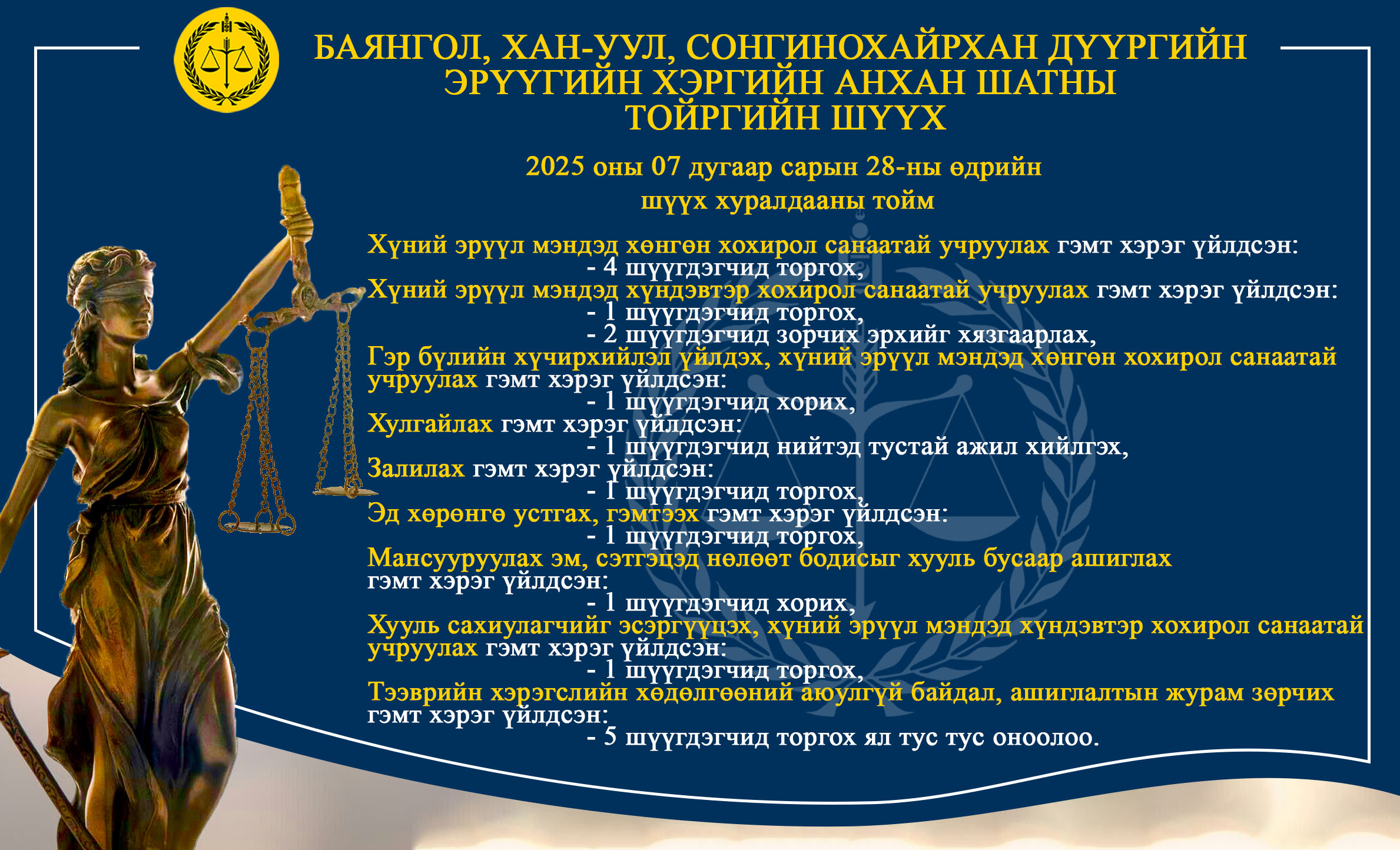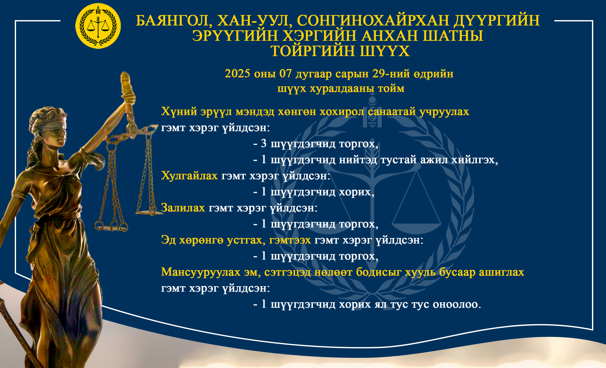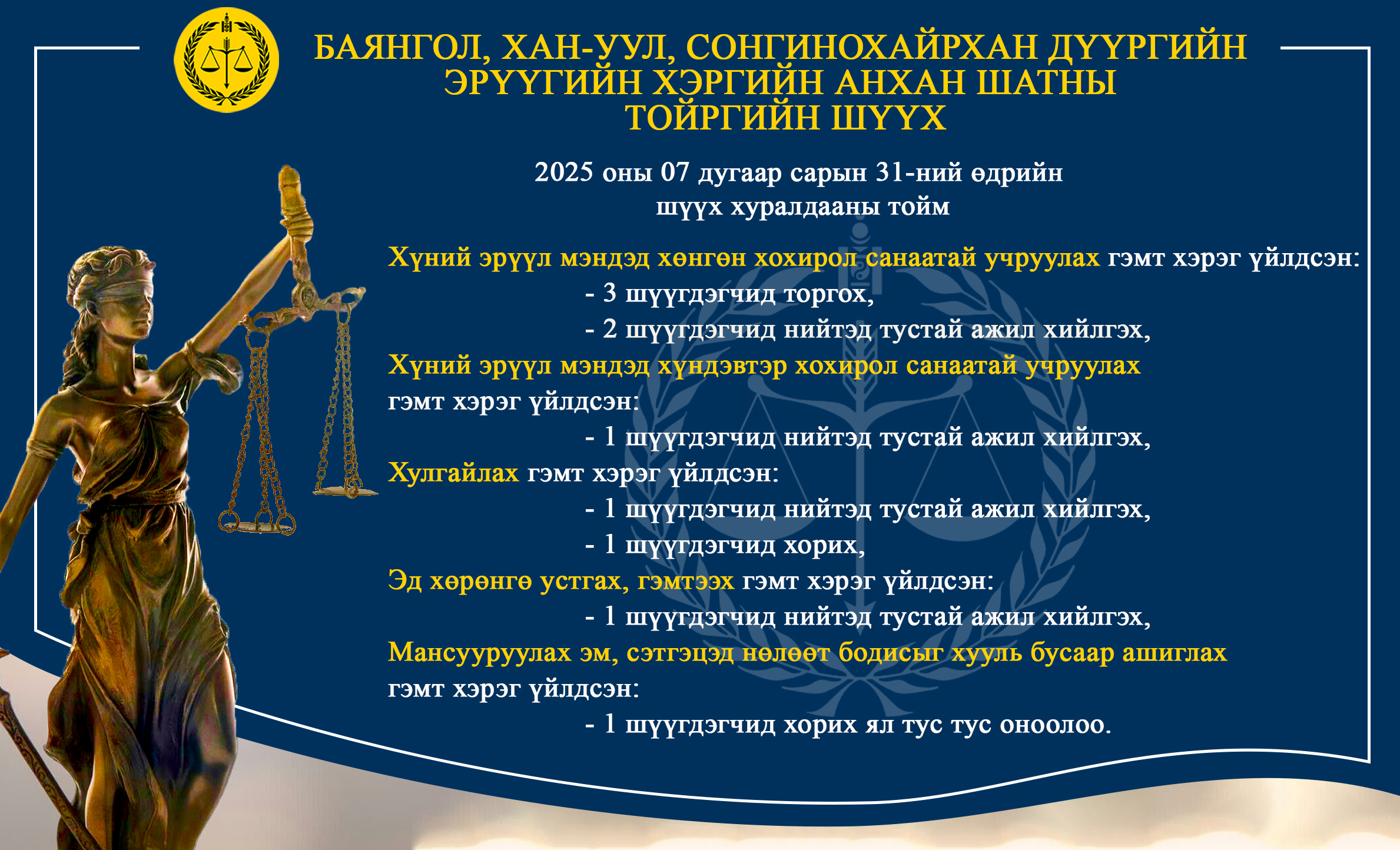 - БАЯНГОЛ, ХАН-УУЛ, СОНГИНОХАЙРХАН ДҮҮРГИЙН ЭРҮҮГИЙН ХЭРГИЙН АНХАН ШАТНЫ ТОЙРГИЙН ШҮҮХ ТОЙМ /2025.07.28-2025.08.01/