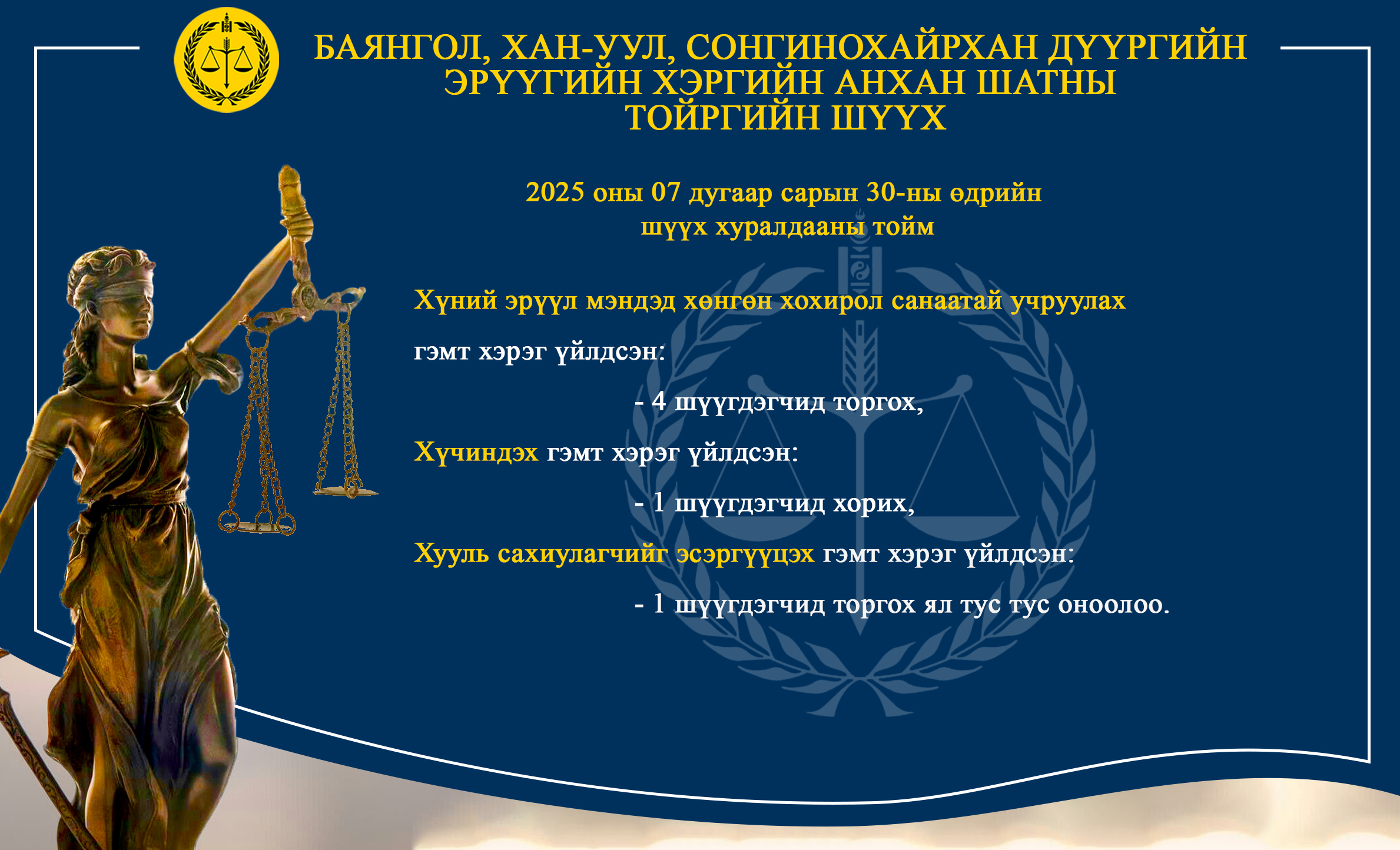 БАЯНГОЛ, ХАН-УУЛ, СОНГИНОХАЙРХАН ДҮҮРГИЙН ЭРҮҮГИЙН ХЭРГИЙН АНХАН ШАТНЫ ТОЙРГИЙН ШҮҮХ ТОЙМ /2025.07.28-2025.08.01/
