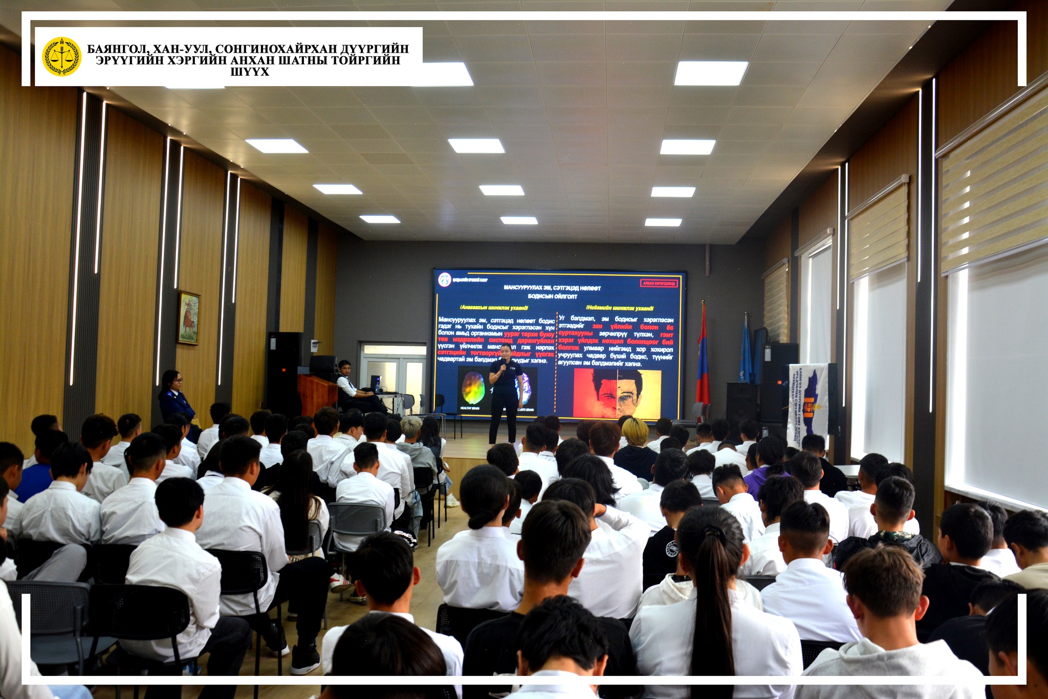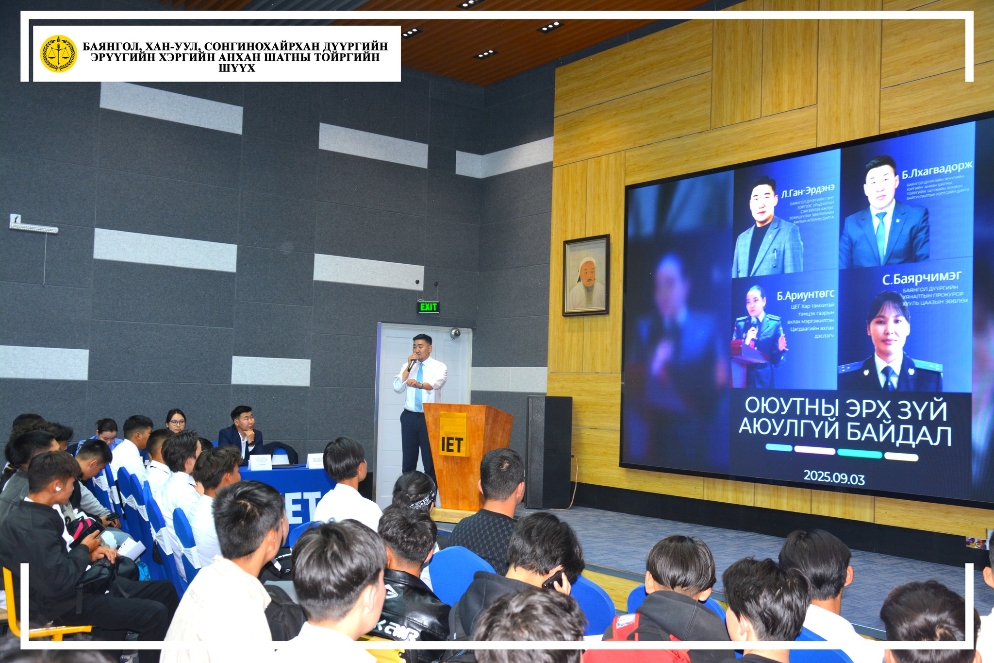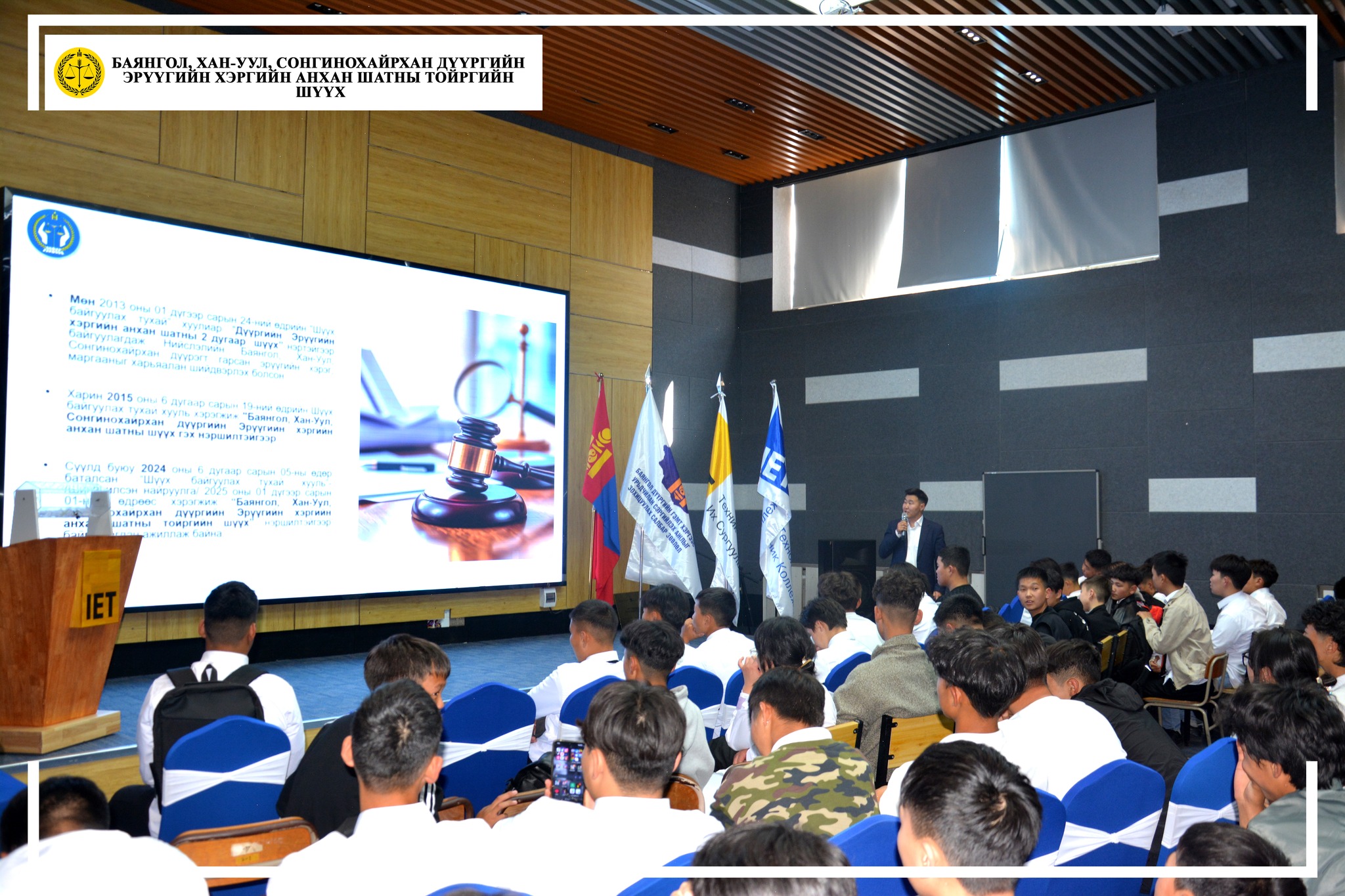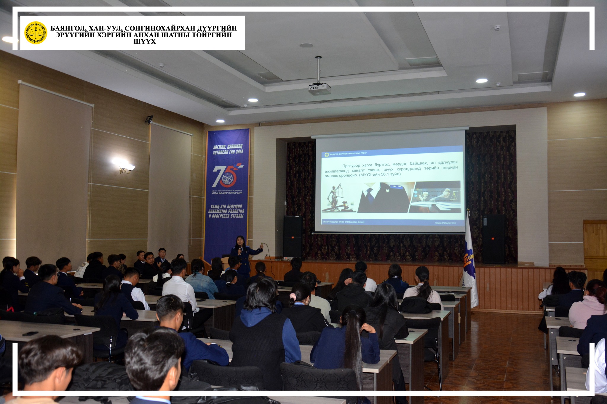 Тус шүүхийн тамгын газраас их, дээд сургууль, коллежийн шинэ элсэгчдэд гэмт хэрэг, зөрчлөөс урьдчилан сэргийлэх мэдлэг олгох, гэмт хэргийн хохирогч болохоос хамгаалах, эрх зүйн мэдлэгийг дээшлүүлэх зорилгоор сургалт зохион байгуулав.