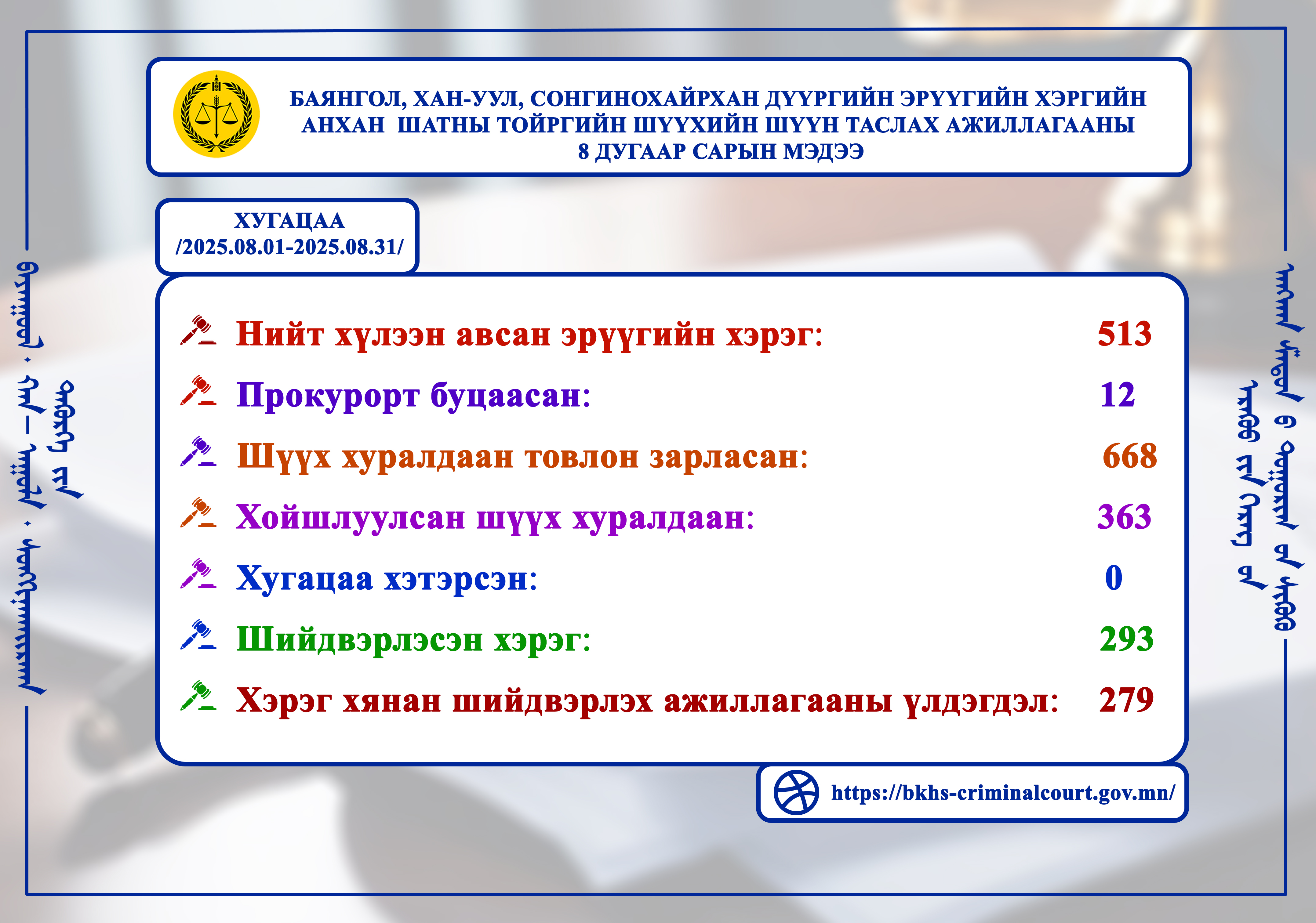 ШҮҮН ТАСЛАХ АЖИЛЛАГААНЫ МЭДЭЭ 2025 оны 8 дугаар сарын шүүн таслах ажиллагааны мэдээг танилцуулж байна.