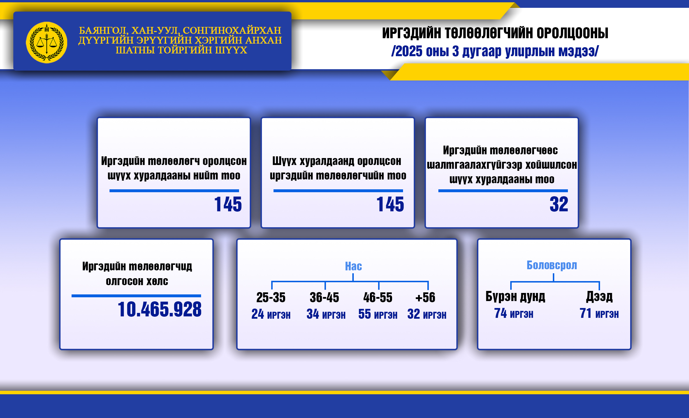 - Тус шүүхийн "ИРГЭДИЙН ТӨЛӨӨЛӨГЧИЙН ОРОЛЦООНЫ МЭДЭЭ"-г 2025 оны 3 дугаар улирлын байдлаар буюу /2024.12.21-2025.09.19/ өдрөөр тасалбар болгон танилцуулж байна