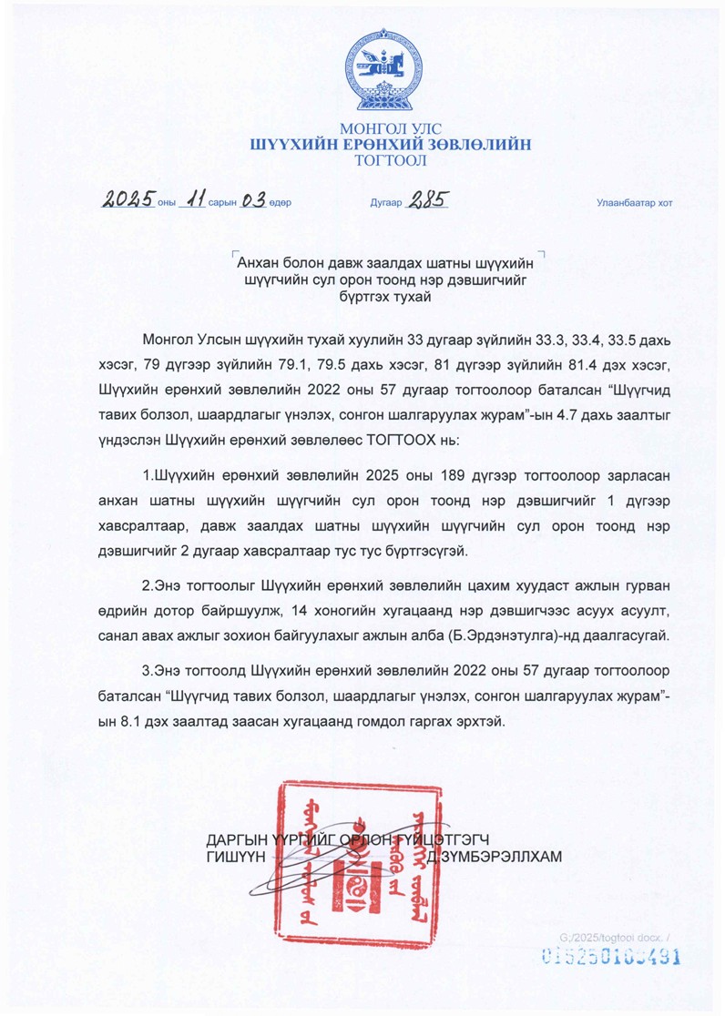 Нэр дэвшигчдээс асуух асуулт, саналыг 14 хоногийн хугацаанд shuugch-songon@judcouncil.mn хаягаар хүлээн авна.