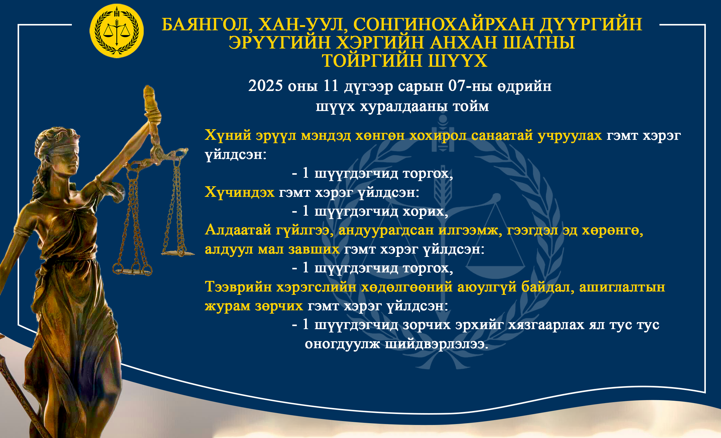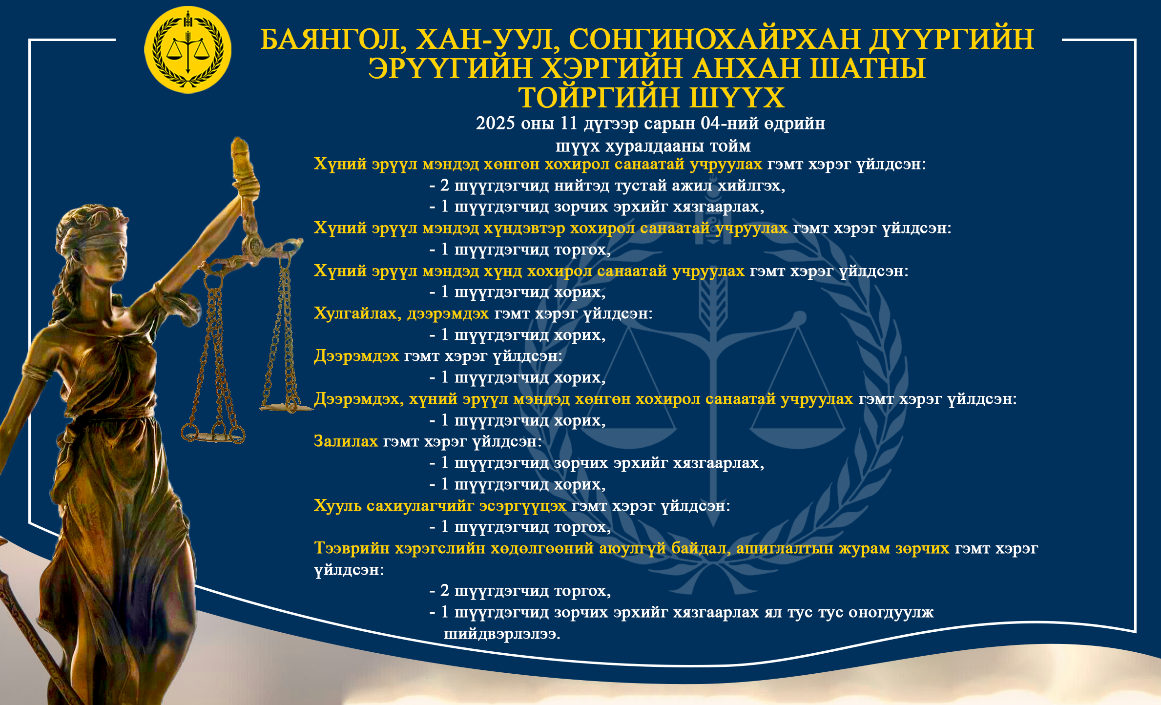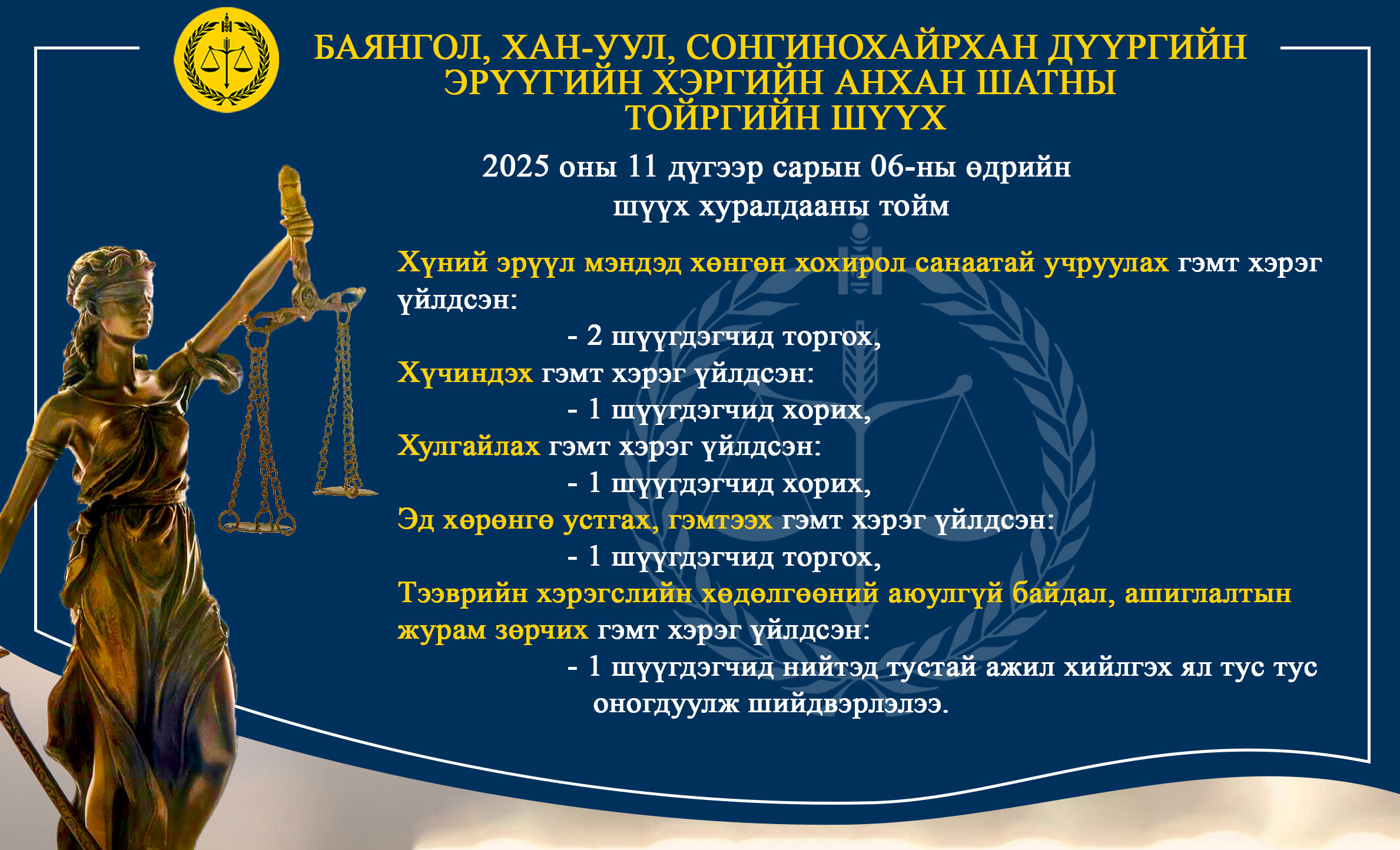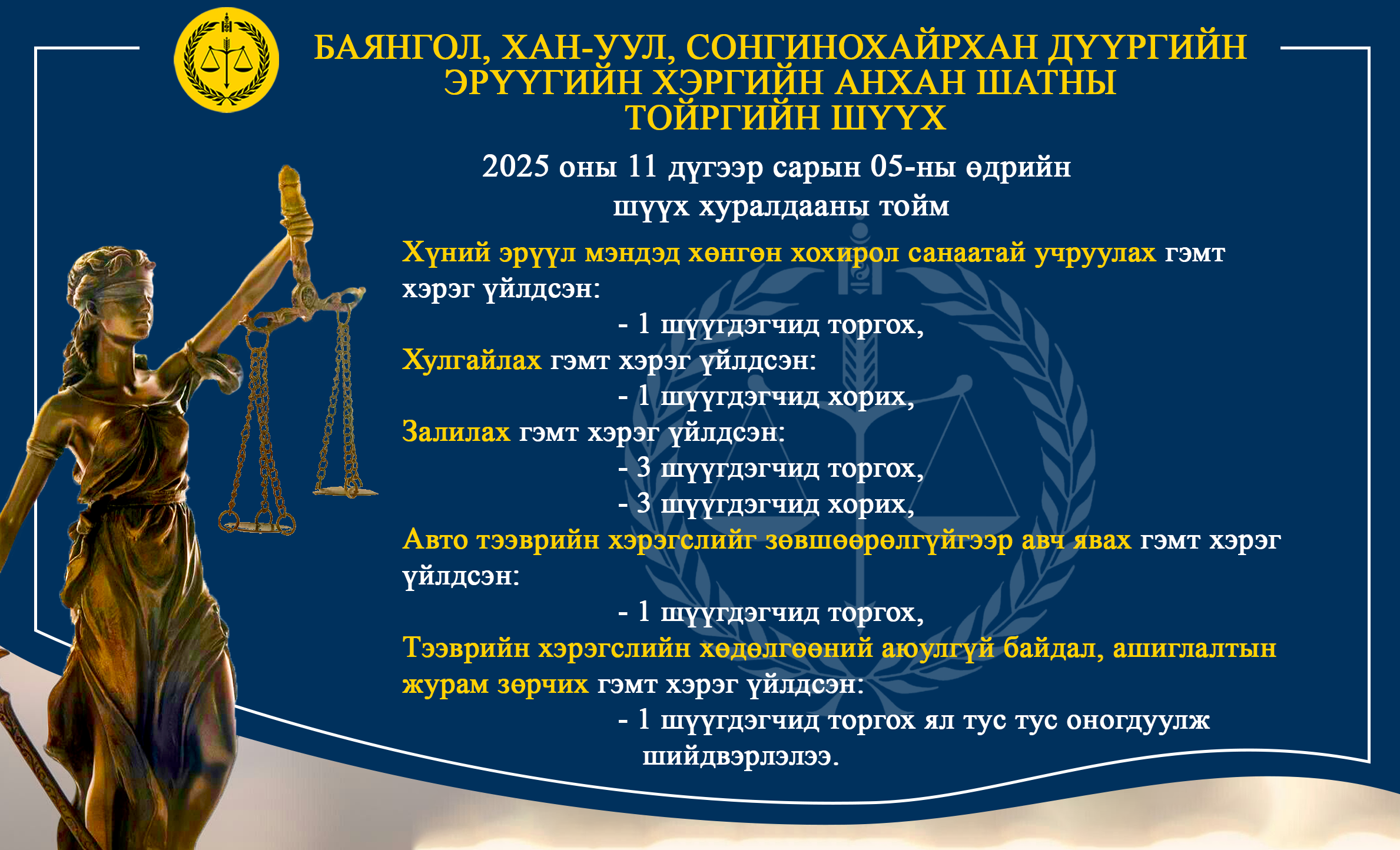 - БАЯНГОЛ, ХАН-УУЛ, СОНГИНОХАЙРХАН ДҮҮРГИЙН ЭРҮҮГИЙН ХЭРГИЙН АНХАН ШАТНЫ ТОЙРГИЙН ШҮҮХ ТОЙМ /2025.11.04-2025.11.07/