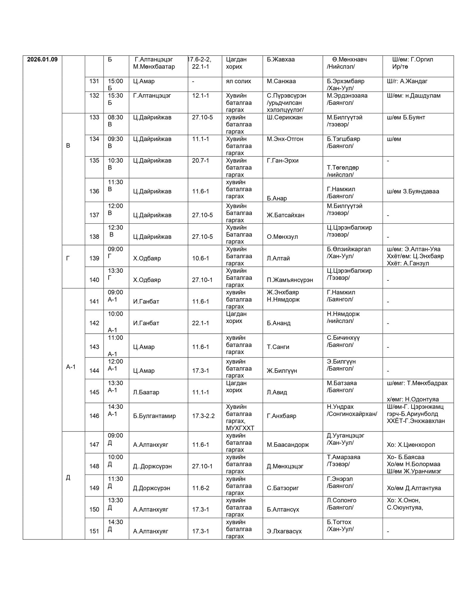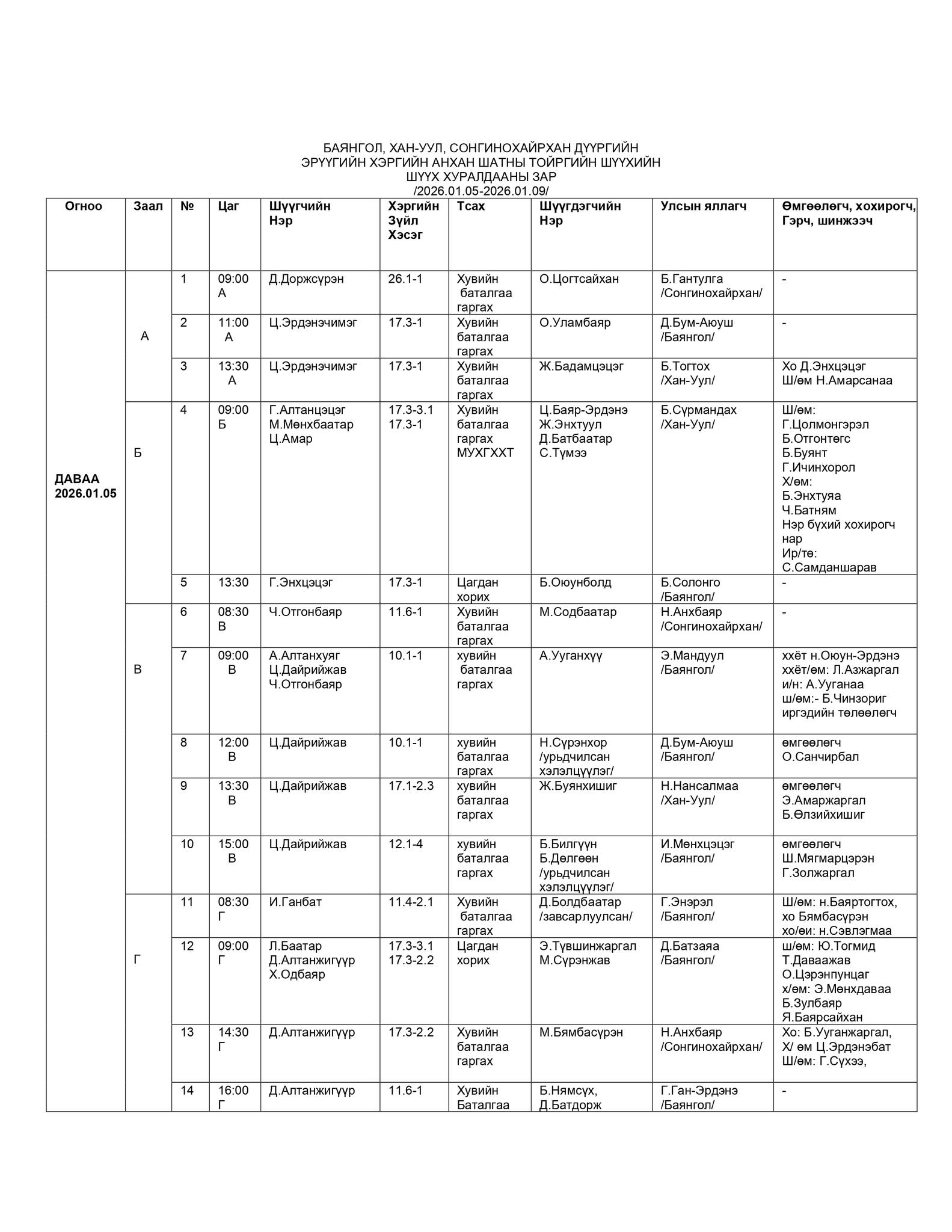 БАЯНГОЛ, ХАН-УУЛ, СОНГИНОХАЙРХАН ДҮҮРГИЙН ЭРҮҮГИЙН ХЭРГИЙН АНХАН ШАТНЫ ТОЙРГИЙН ШҮҮХИЙН ШҮҮХ ХУРАЛДААНЫ ЗАР /2026.01.05-2026.01.09/