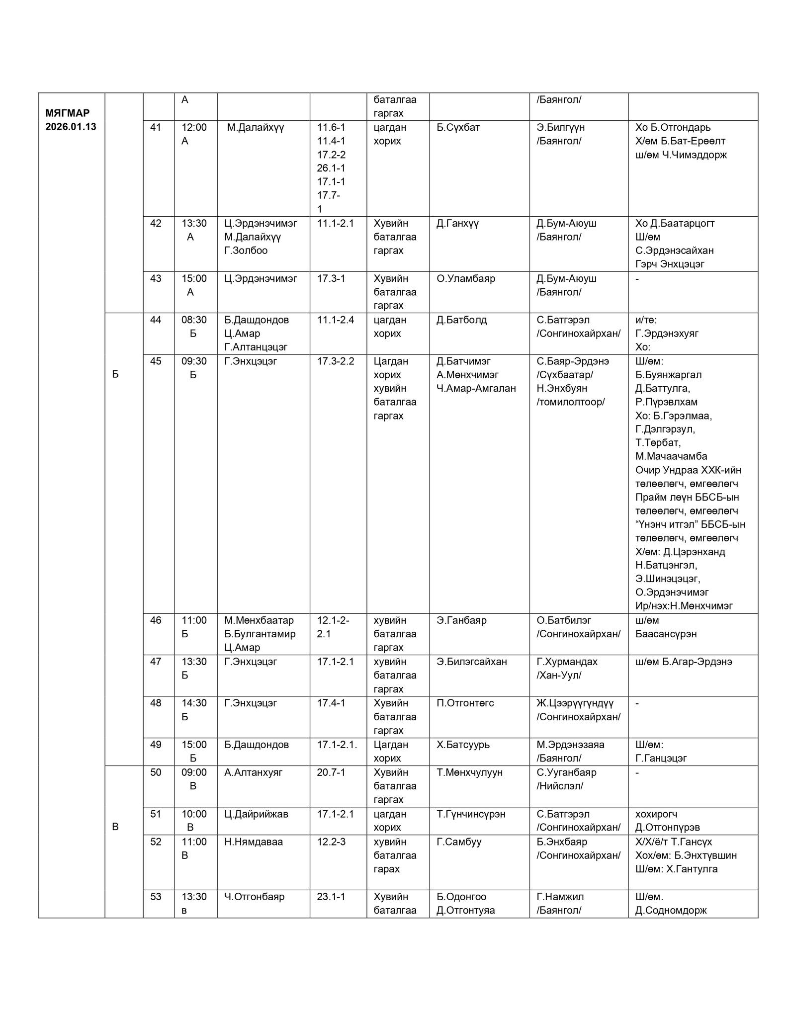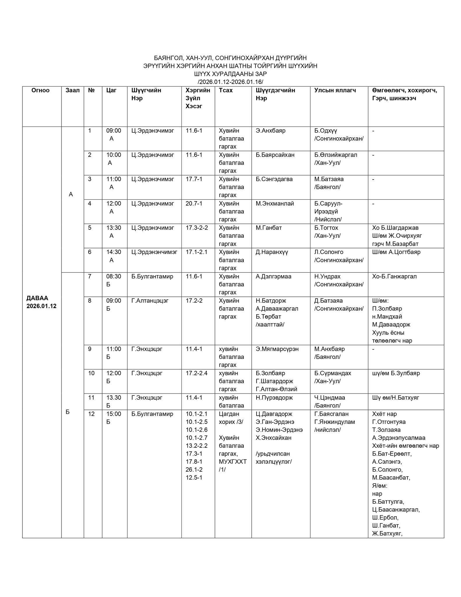 БАЯНГОЛ, ХАН-УУЛ, СОНГИНОХАЙРХАН ДҮҮРГИЙН ЭРҮҮГИЙН ХЭРГИЙН АНХАН ШАТНЫ ТОЙРГИЙН ШҮҮХИЙН ШҮҮХ ХУРАЛДААНЫ ЗАР /2026.01.12-2026.01.16/