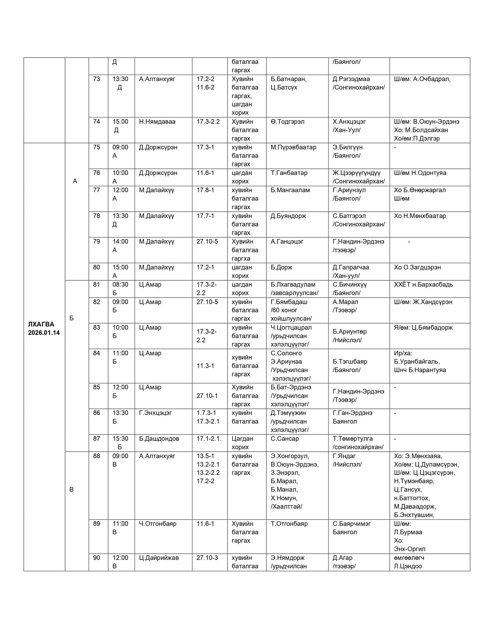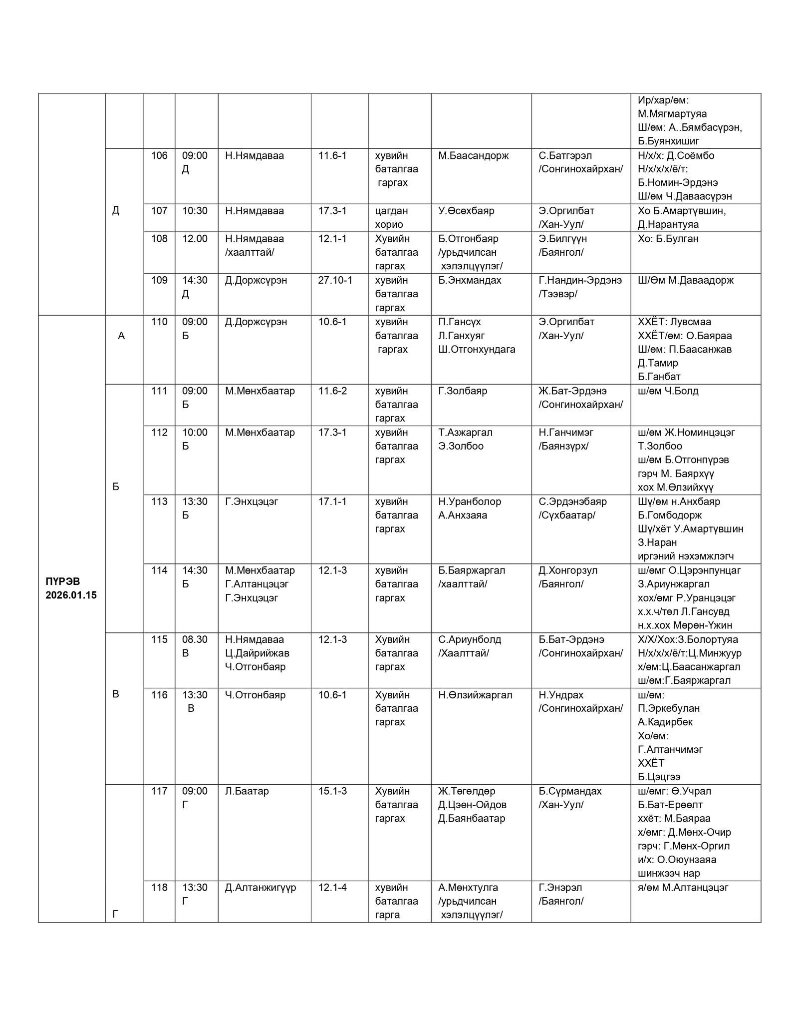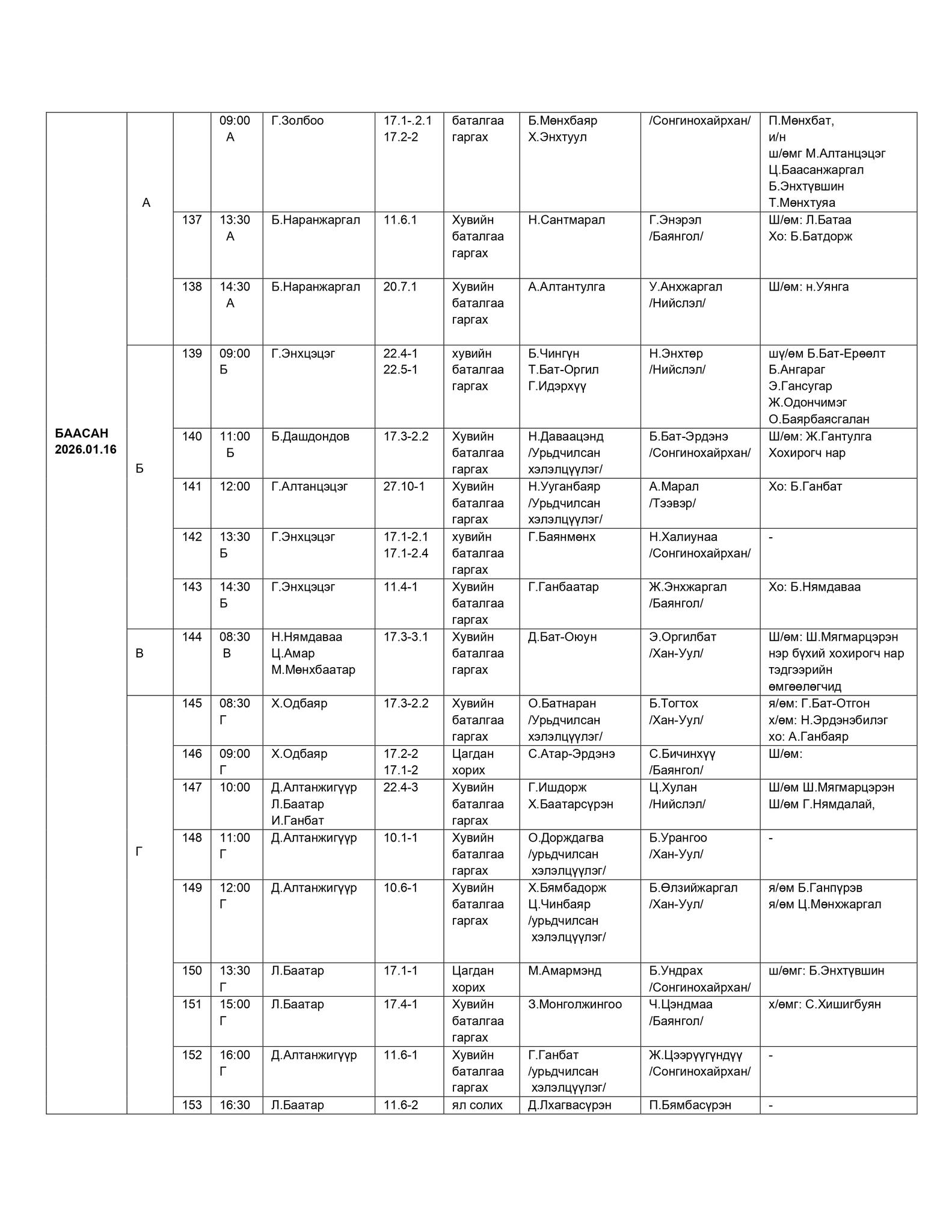 - БАЯНГОЛ, ХАН-УУЛ, СОНГИНОХАЙРХАН ДҮҮРГИЙН ЭРҮҮГИЙН ХЭРГИЙН АНХАН ШАТНЫ ТОЙРГИЙН ШҮҮХИЙН ШҮҮХ ХУРАЛДААНЫ ЗАР /2026.01.12-2026.01.16/