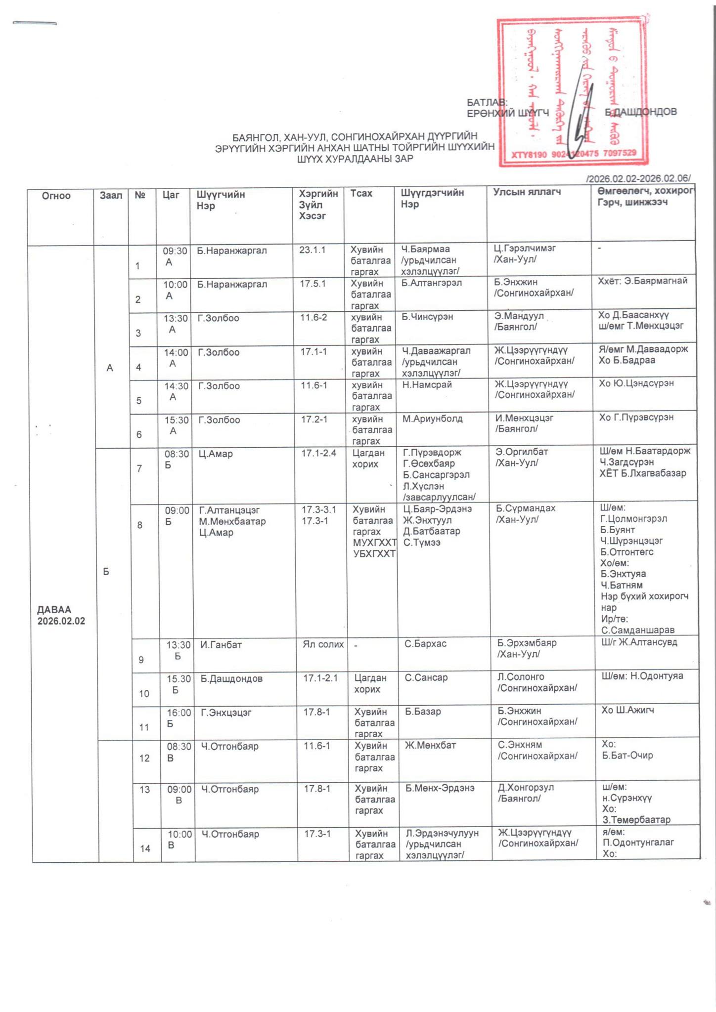 БАЯНГОЛ, ХАН-УУЛ, СОНГИНОХАЙРХАН ДҮҮРГИЙН ЭРҮҮГИЙН ХЭРГИЙН АНХАН ШАТНЫ ТОЙРГИЙН ШҮҮХИЙН ШҮҮХ ХУРАЛДААНЫ ЗАР /2026.02.02-2025.02.06/