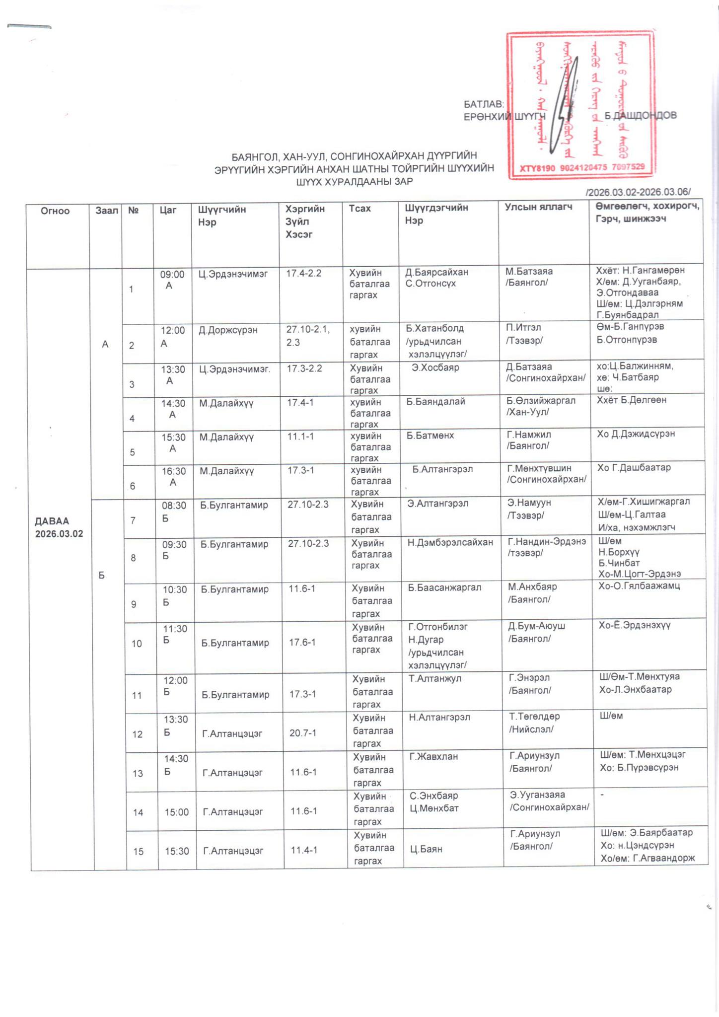 БАЯНГОЛ, ХАН-УУЛ, СОНГИНОХАЙРХАН ДҮҮРГИЙН ЭРҮҮГИЙН ХЭРГИЙН АНХАН ШАТНЫ ТОЙРГИЙН ШҮҮХИЙН ШҮҮХ ХУРАЛДААНЫ ЗАР /2026.03.02-03.06/