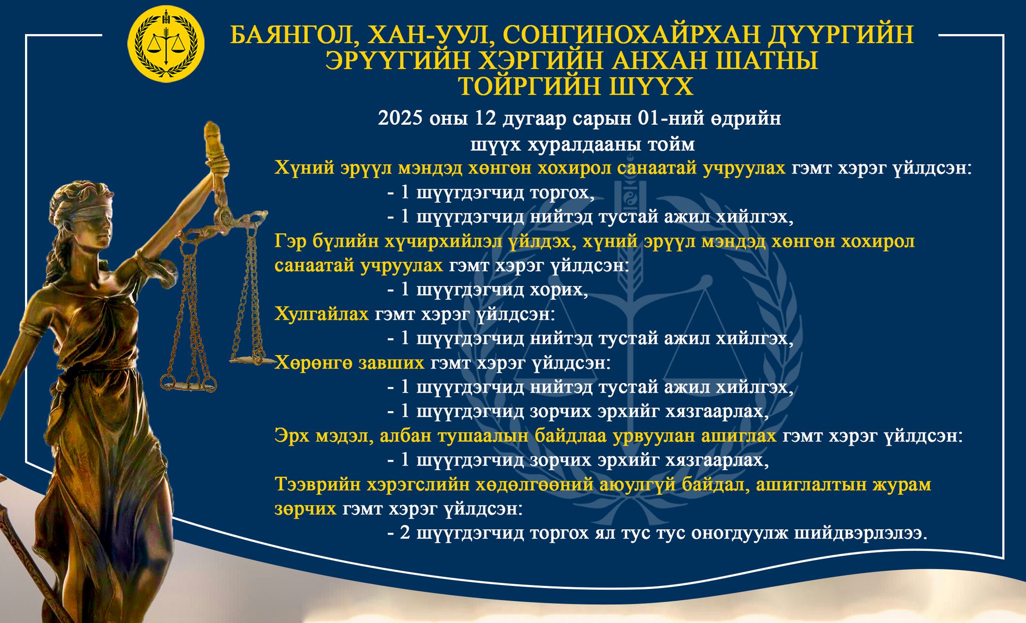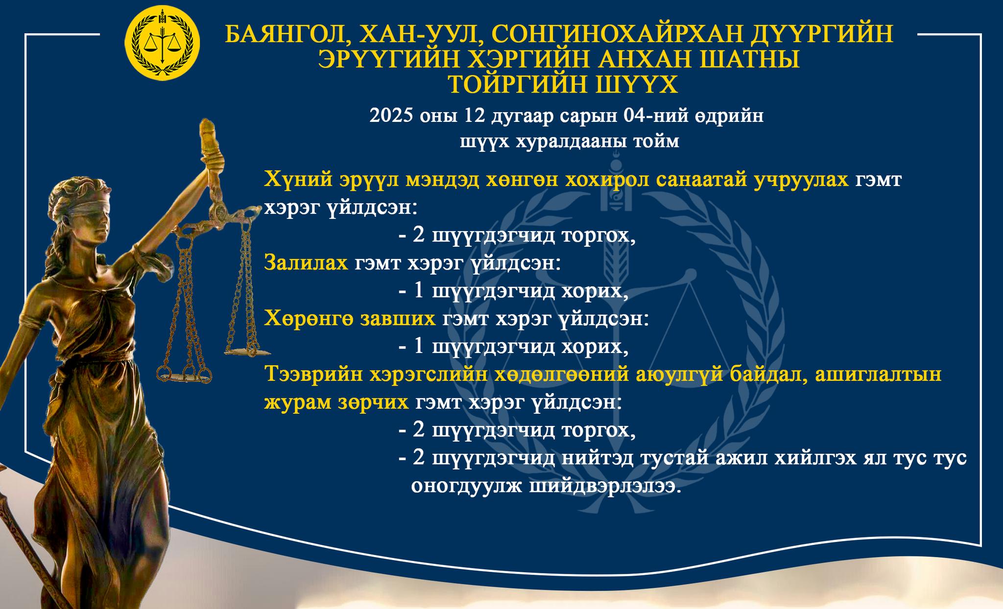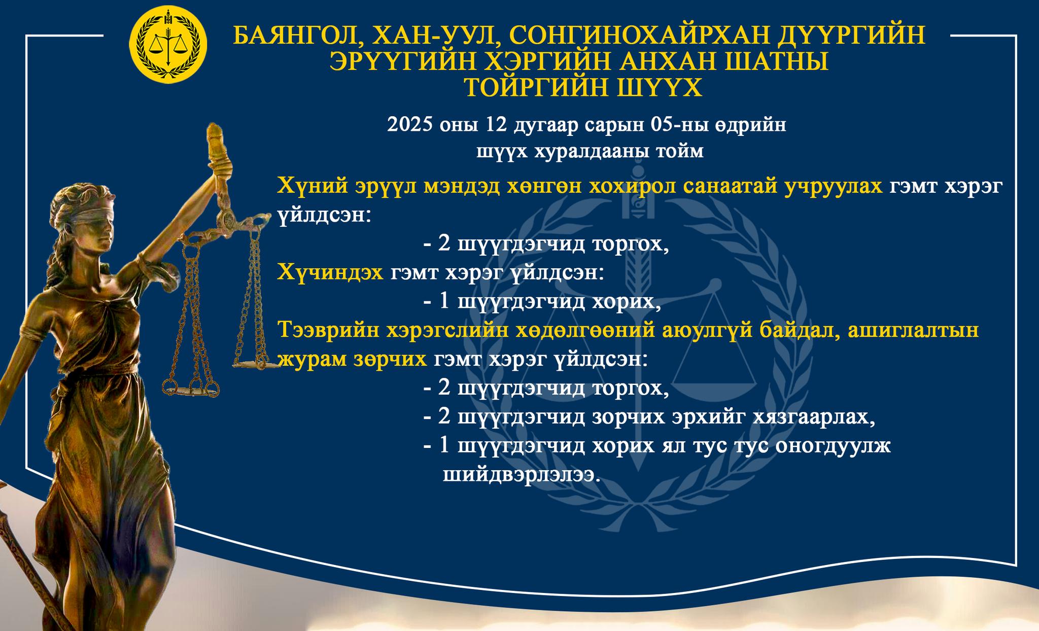 - БАЯНГОЛ, ХАН-УУЛ, СОНГИНОХАЙРХАН ДҮҮРГИЙН ЭРҮҮГИЙН ХЭРГИЙН АНХАН ШАТНЫ ТОЙРГИЙН ШҮҮХ ТОЙМ /2025.12.01-2025.12.05/