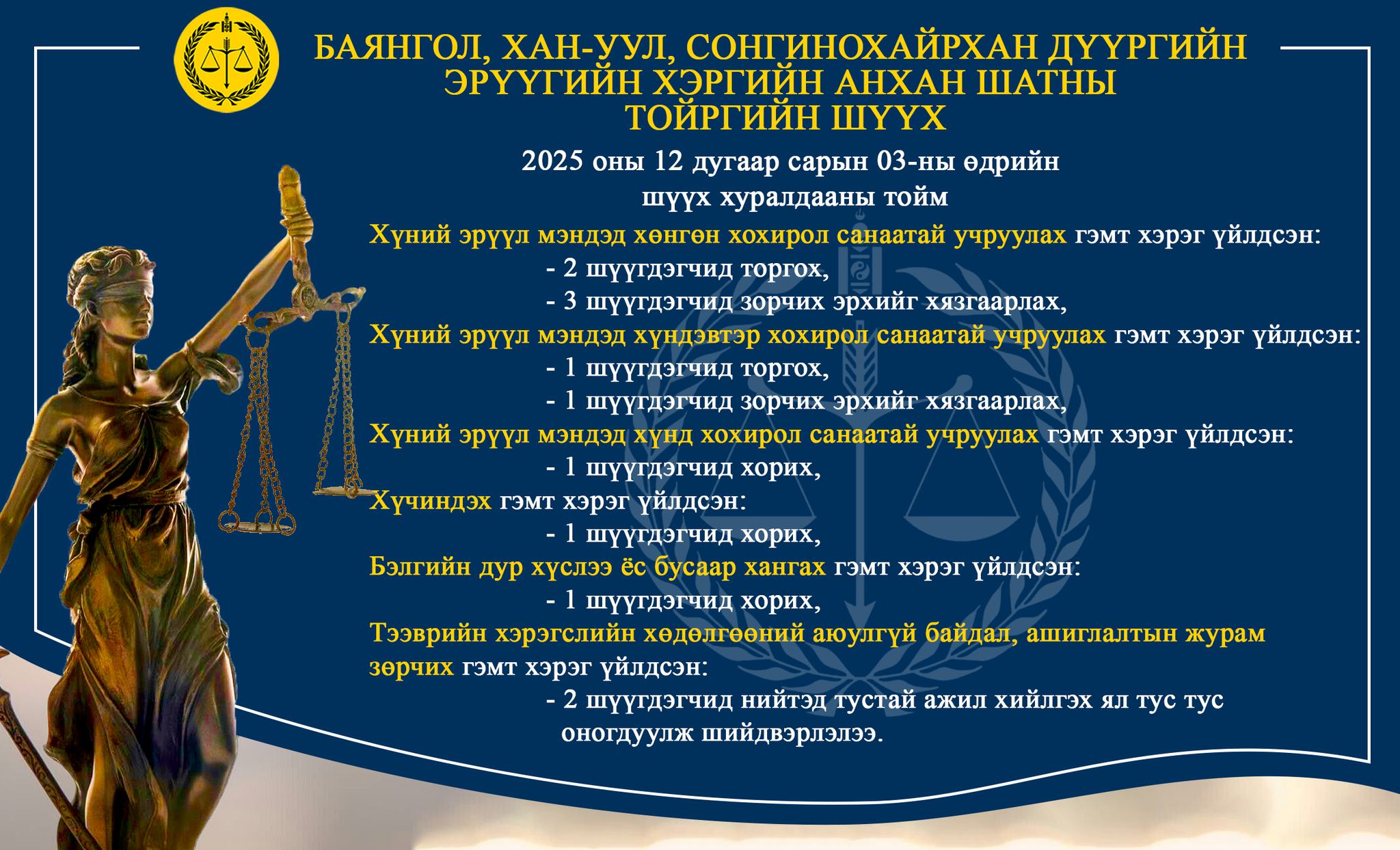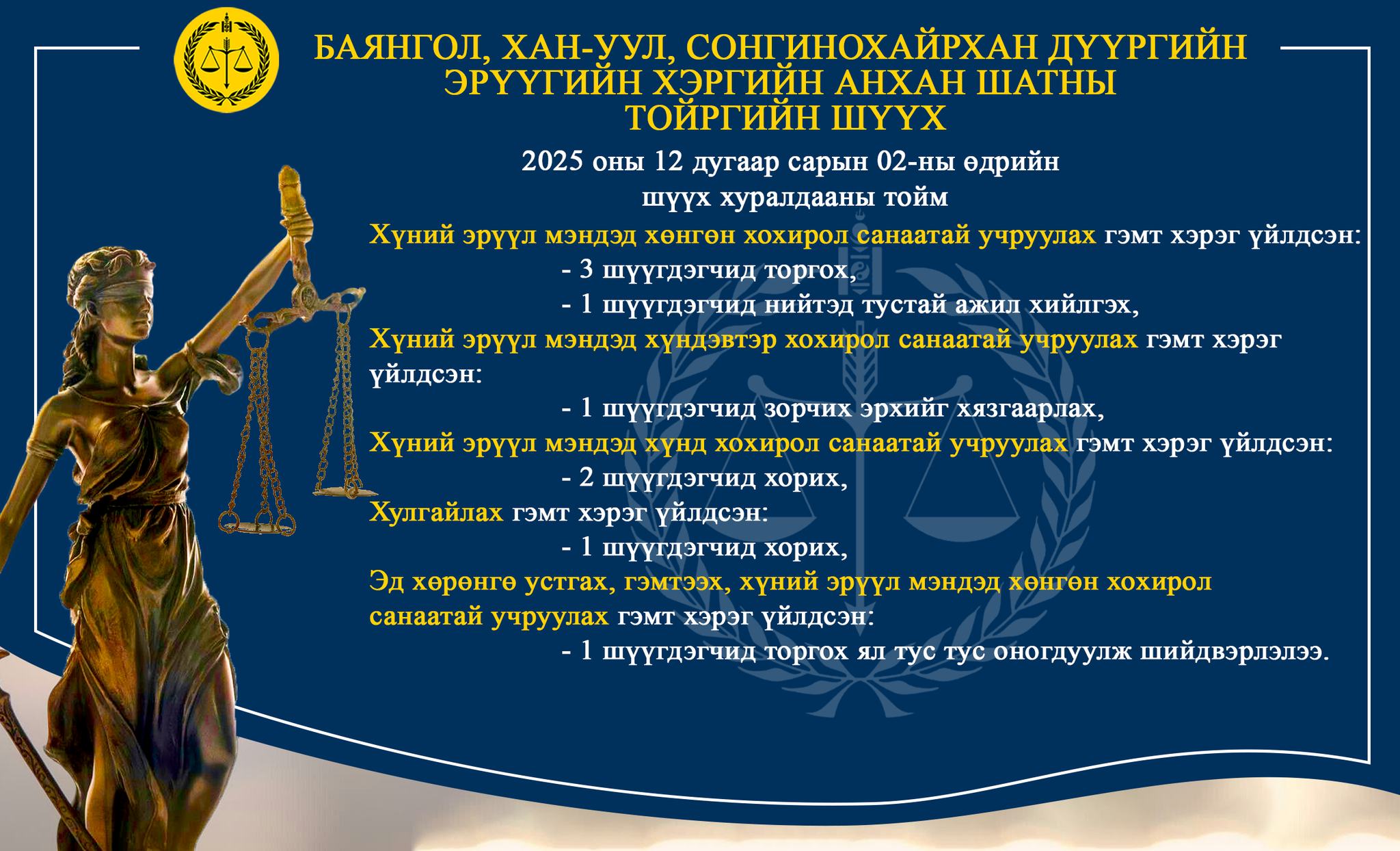 БАЯНГОЛ, ХАН-УУЛ, СОНГИНОХАЙРХАН ДҮҮРГИЙН ЭРҮҮГИЙН ХЭРГИЙН АНХАН ШАТНЫ ТОЙРГИЙН ШҮҮХ ТОЙМ /2025.12.01-2025.12.05/
