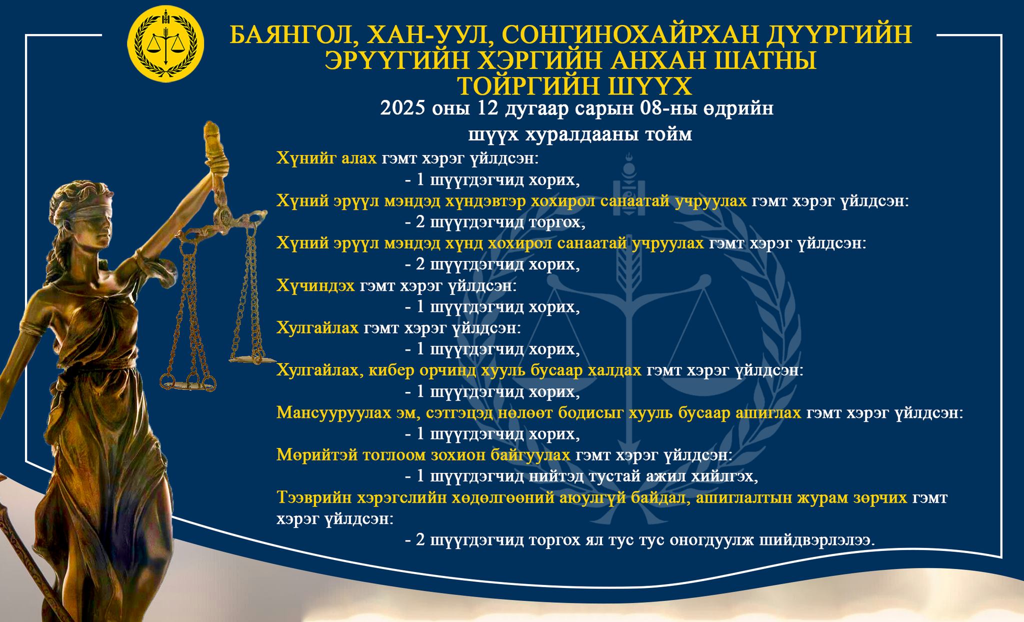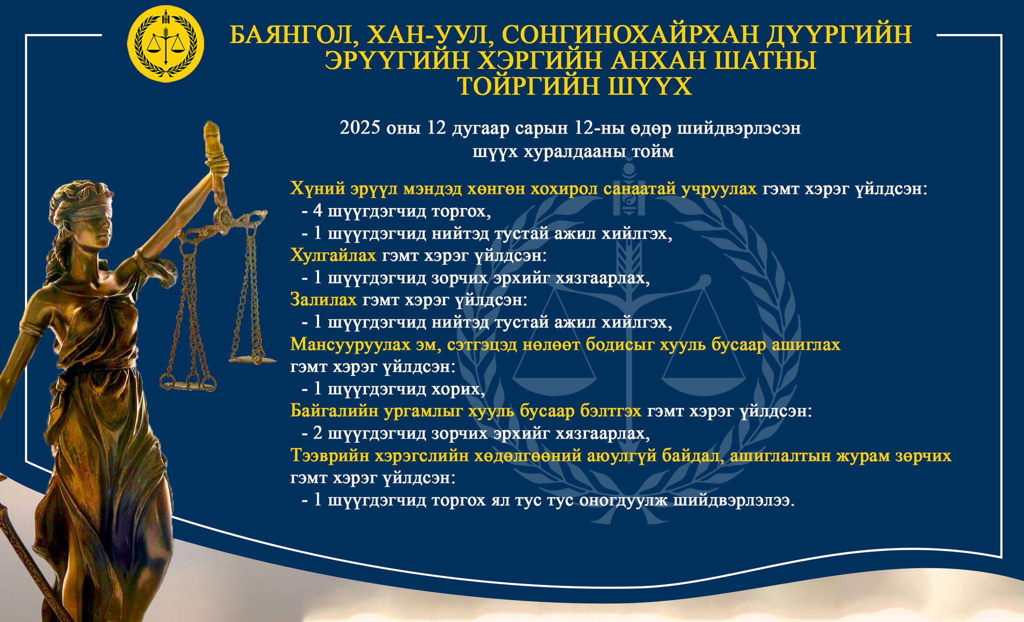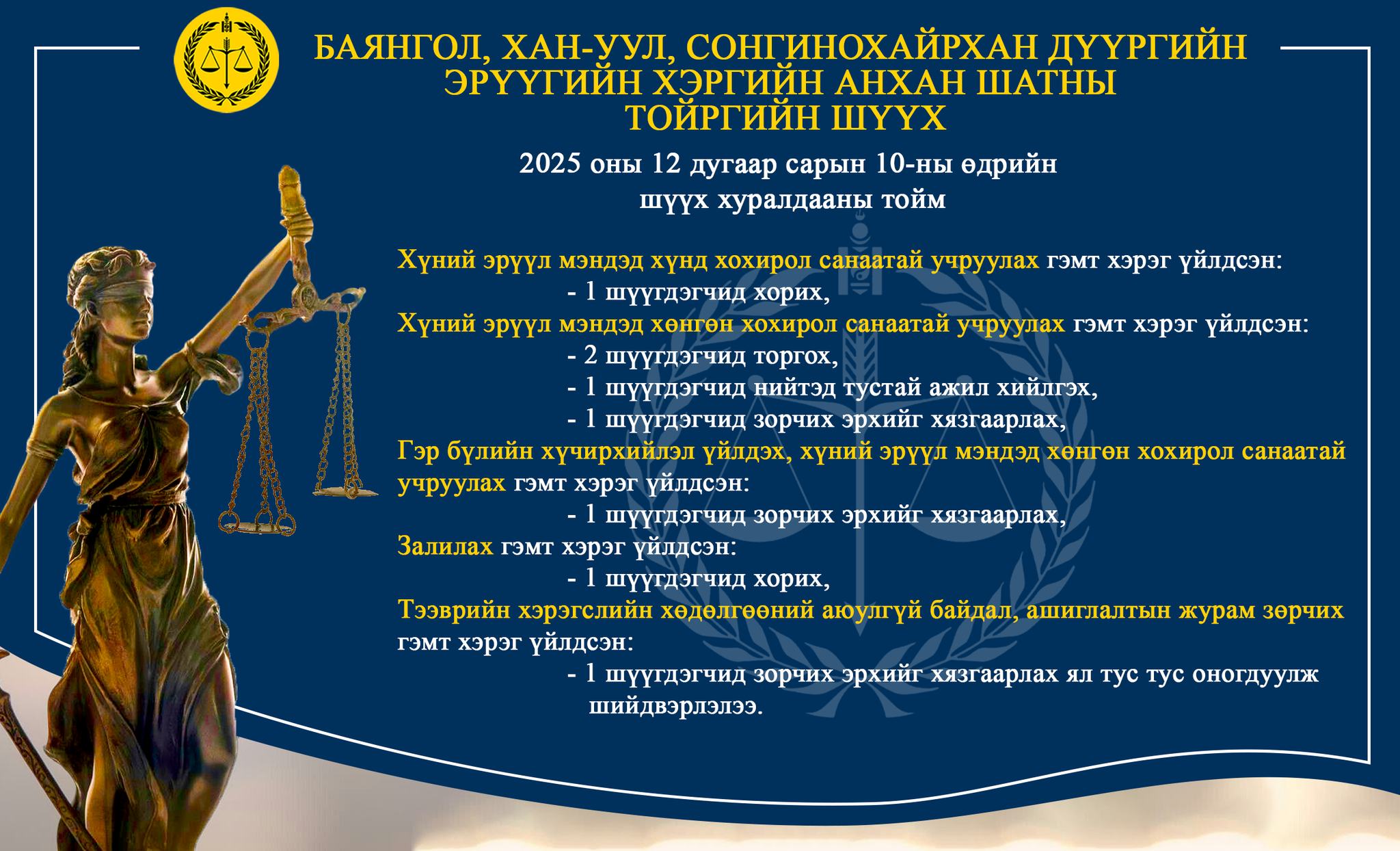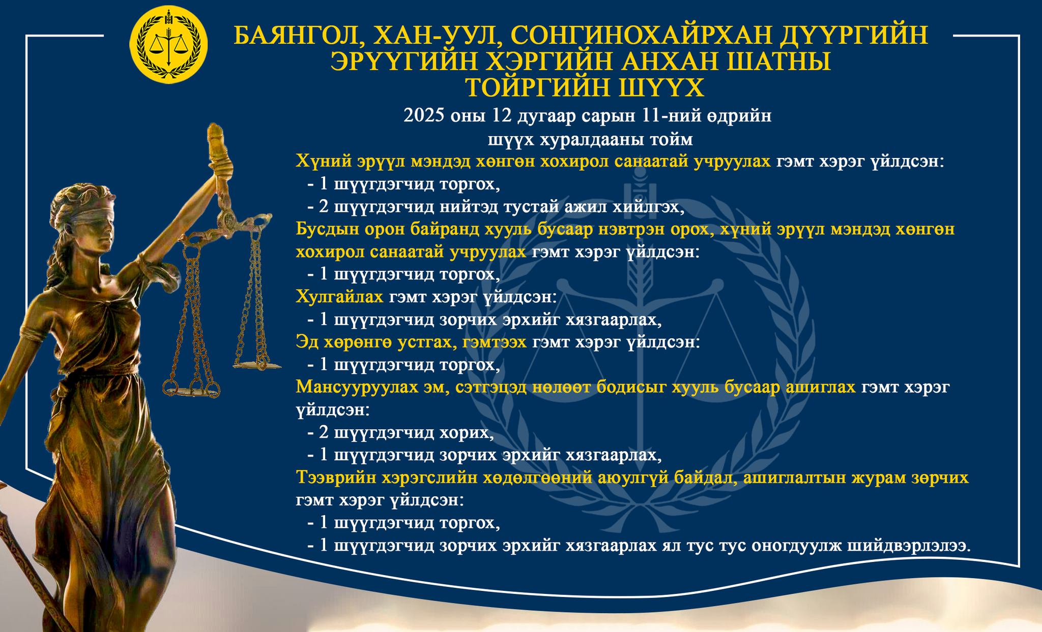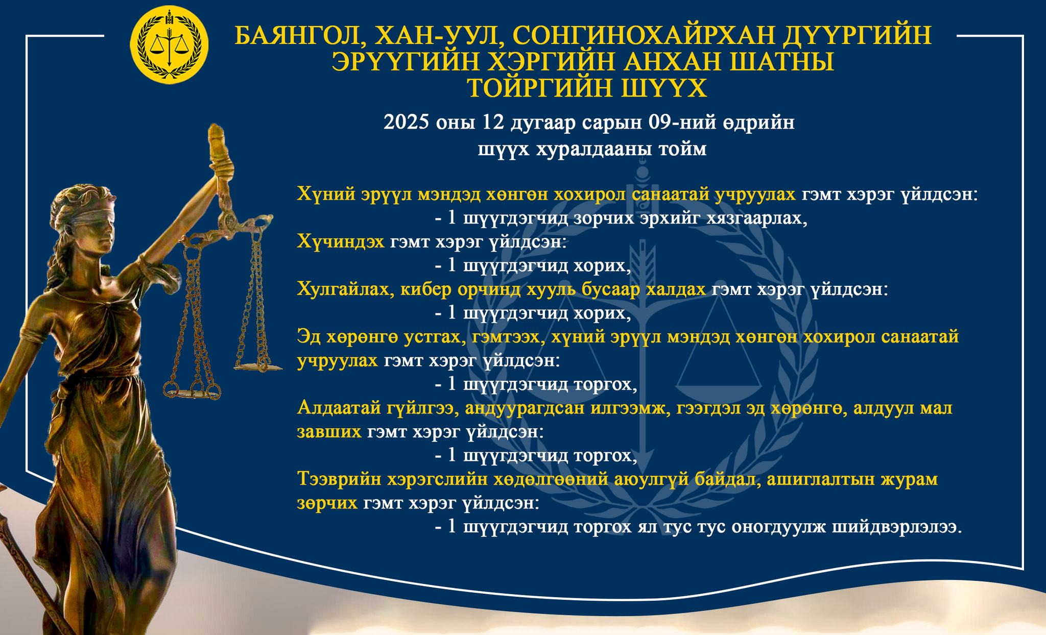 - БАЯНГОЛ, ХАН-УУЛ, СОНГИНОХАЙРХАН ДҮҮРГИЙН ЭРҮҮГИЙН ХЭРГИЙН АНХАН ШАТНЫ ТОЙРГИЙН ШҮҮХ ТОЙМ /2025.12.08-2025.12.12/