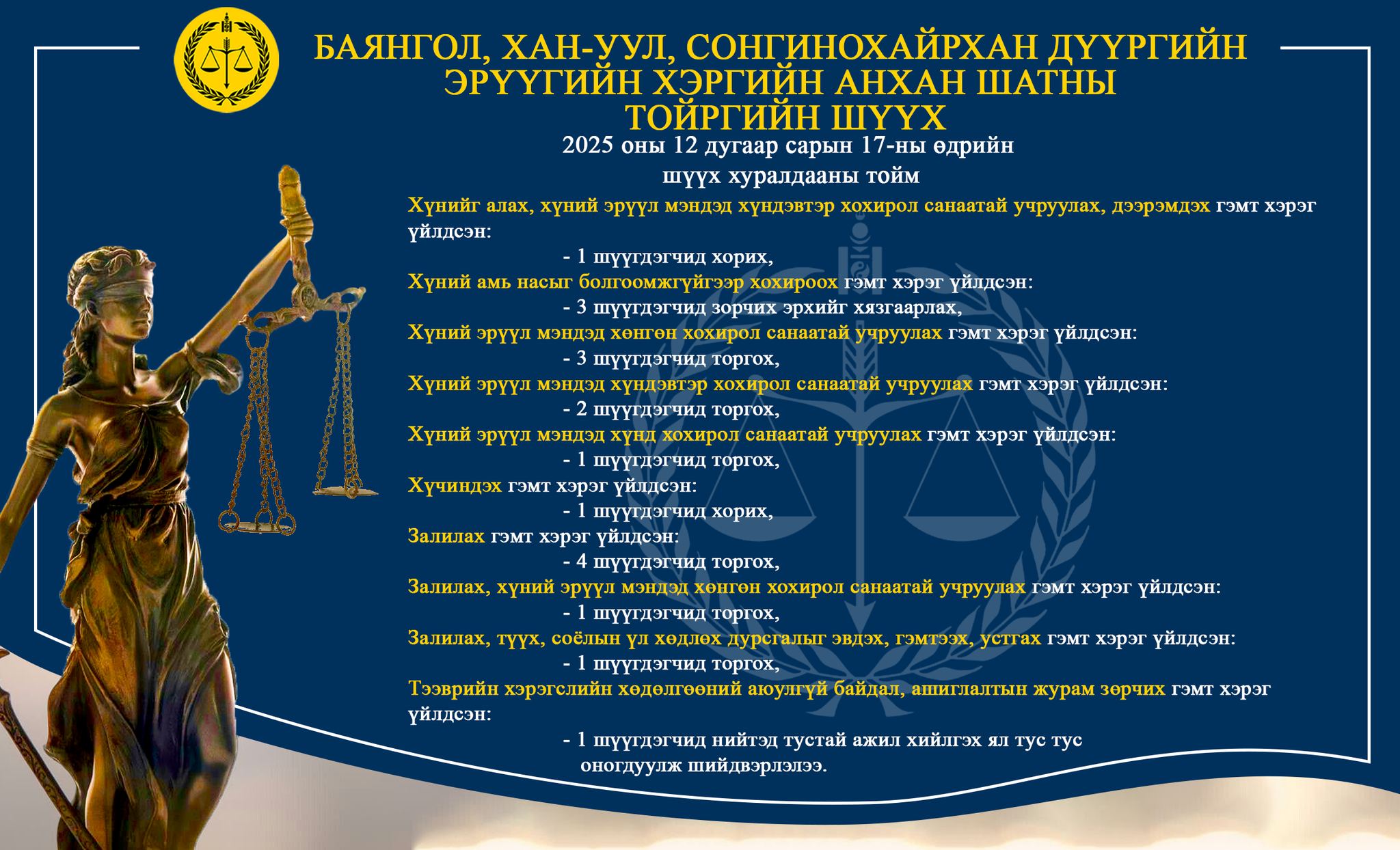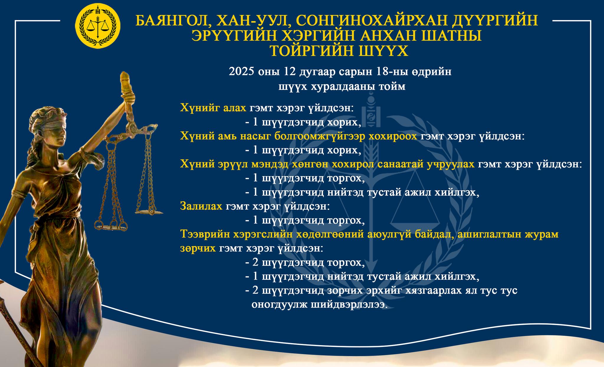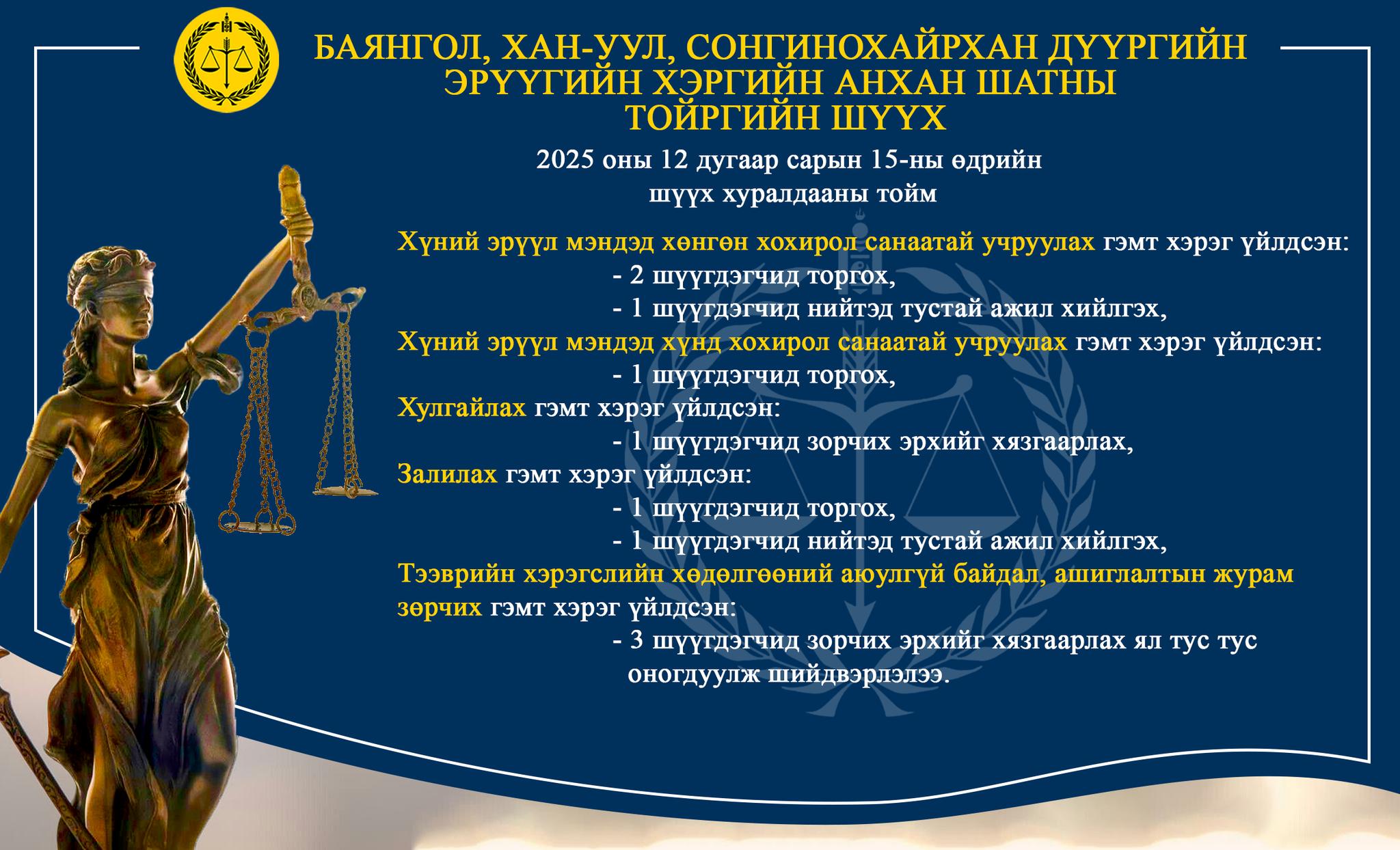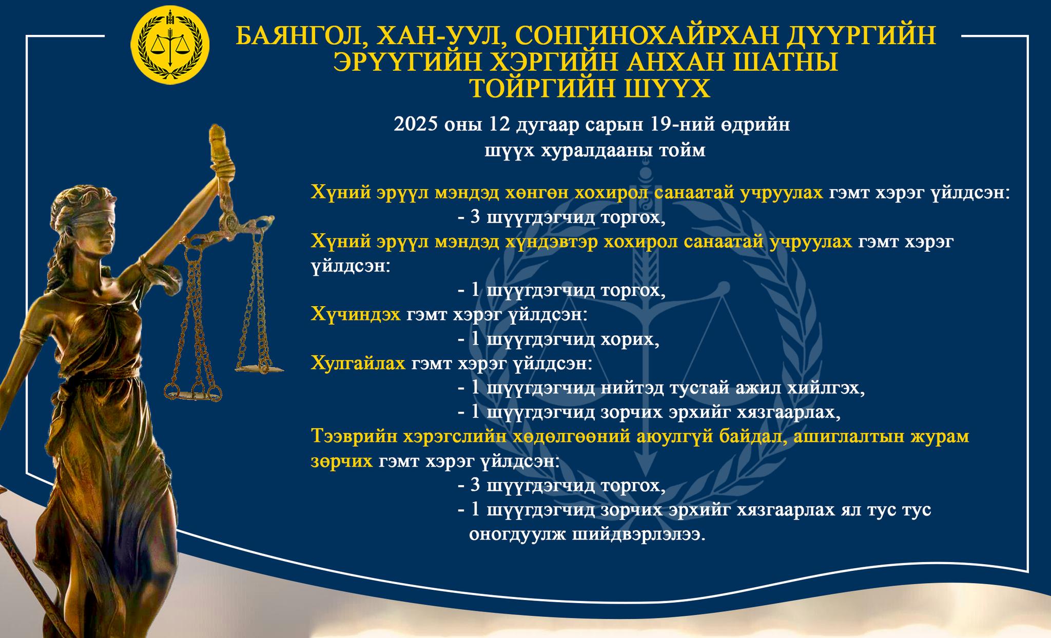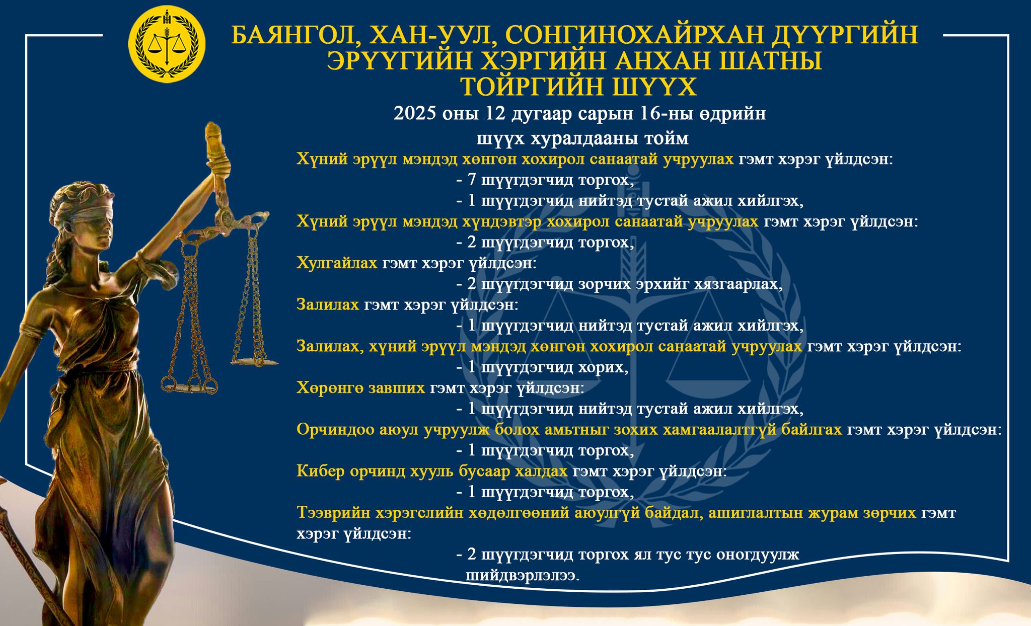 - БАЯНГОЛ, ХАН-УУЛ, СОНГИНОХАЙРХАН ДҮҮРГИЙН ЭРҮҮГИЙН ХЭРГИЙН АНХАН ШАТНЫ ТОЙРГИЙН ШҮҮХ ТОЙМ /2025.12.15-2025.12.19/