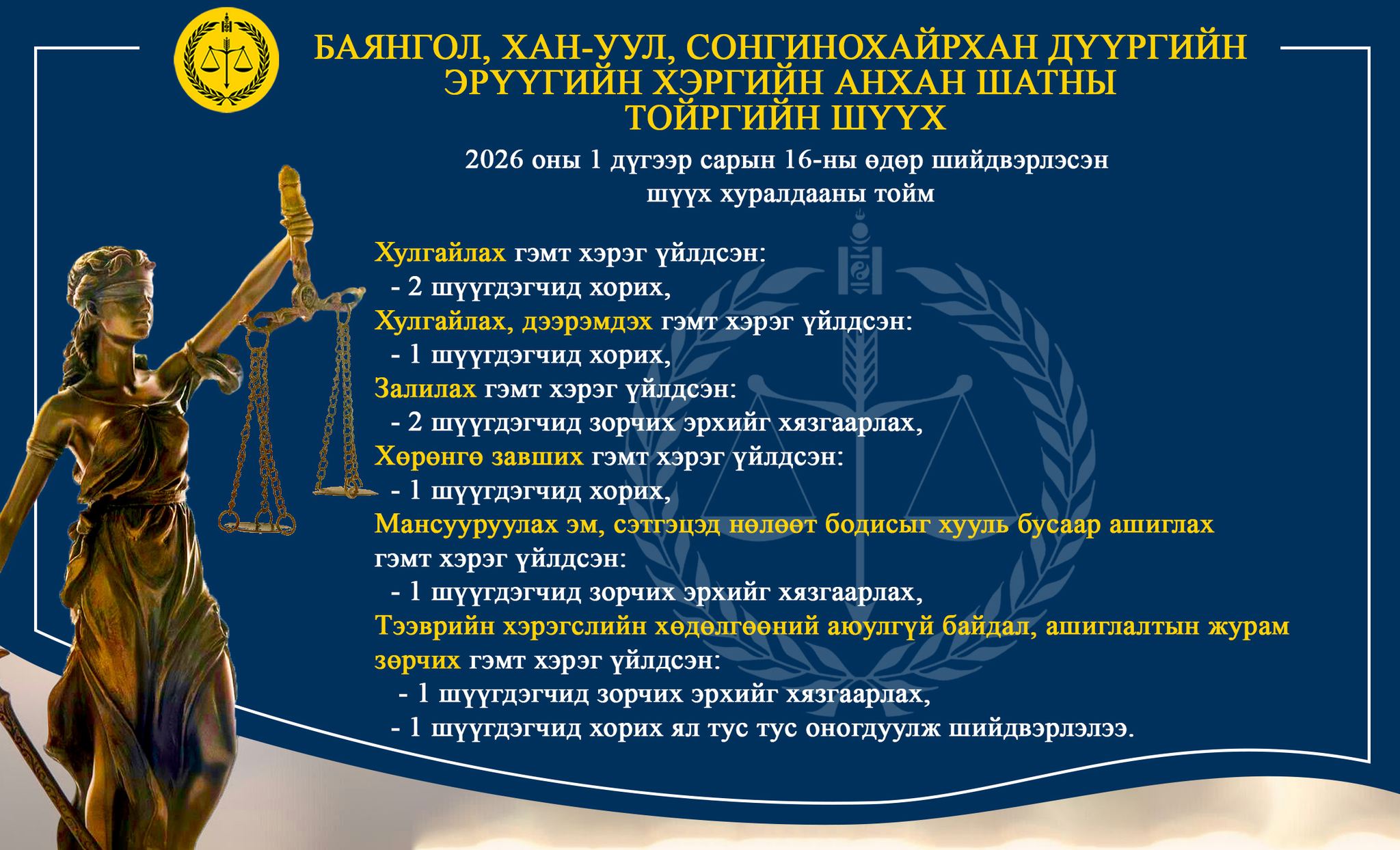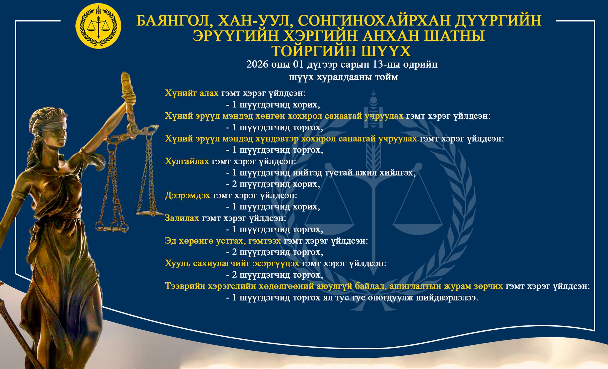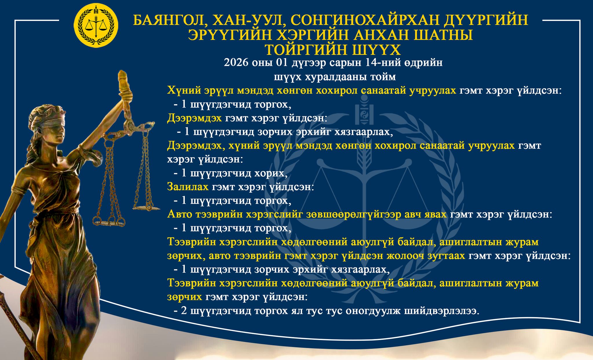 - БАЯНГОЛ, ХАН-УУЛ, СОНГИНОХАЙРХАН ДҮҮРГИЙН ЭРҮҮГИЙН ХЭРГИЙН АНХАН ШАТНЫ ТОЙРГИЙН ШҮҮХ ТОЙМ /2026.01.13-2026.01.16/