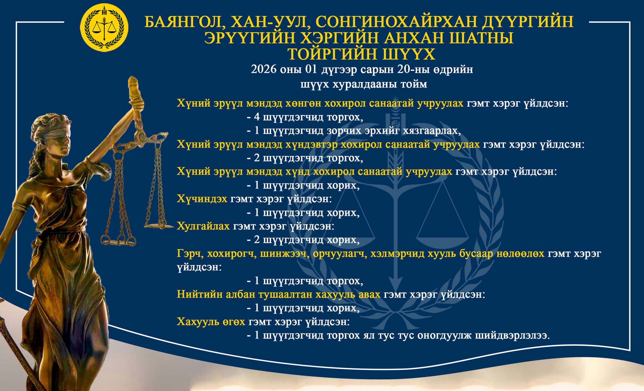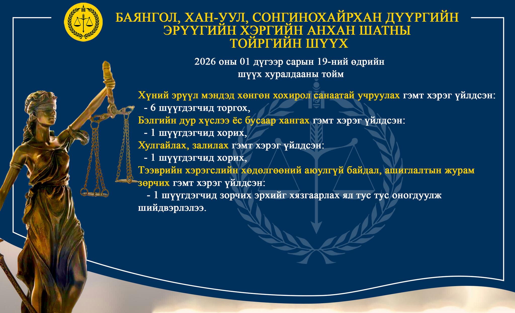 - БАЯНГОЛ, ХАН-УУЛ, СОНГИНОХАЙРХАН ДҮҮРГИЙН ЭРҮҮГИЙН ХЭРГИЙН АНХАН ШАТНЫ ТОЙРГИЙН ШҮҮХ ТОЙМ /2026.01.19-2026.01.20/