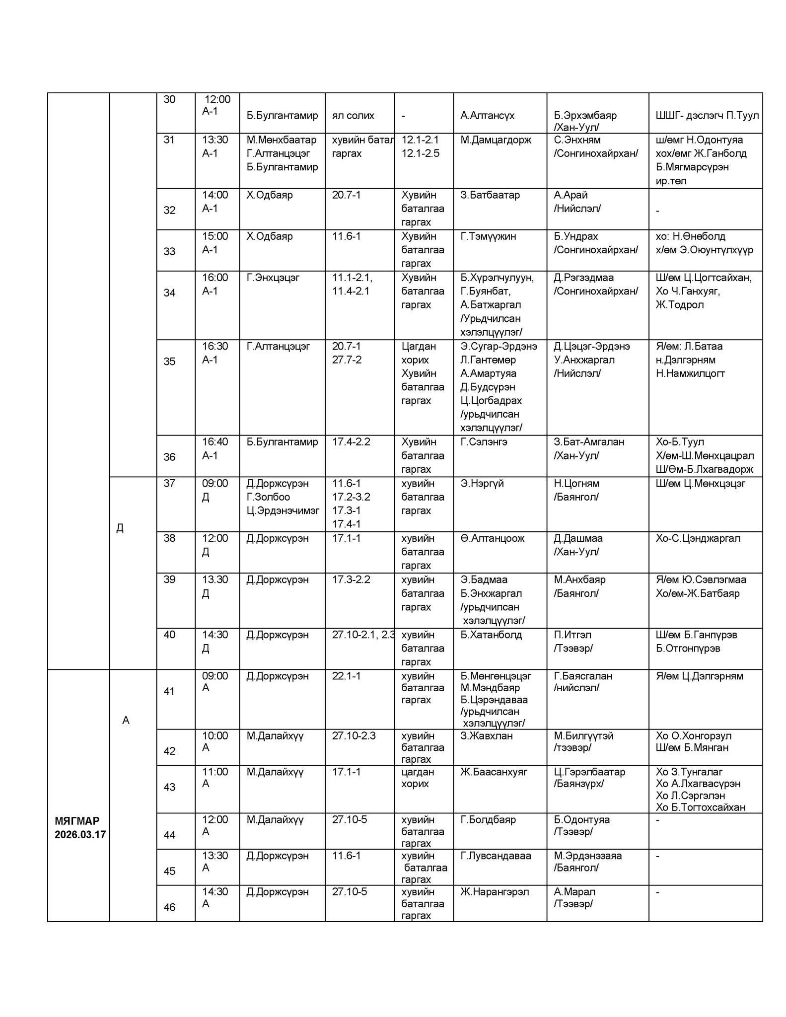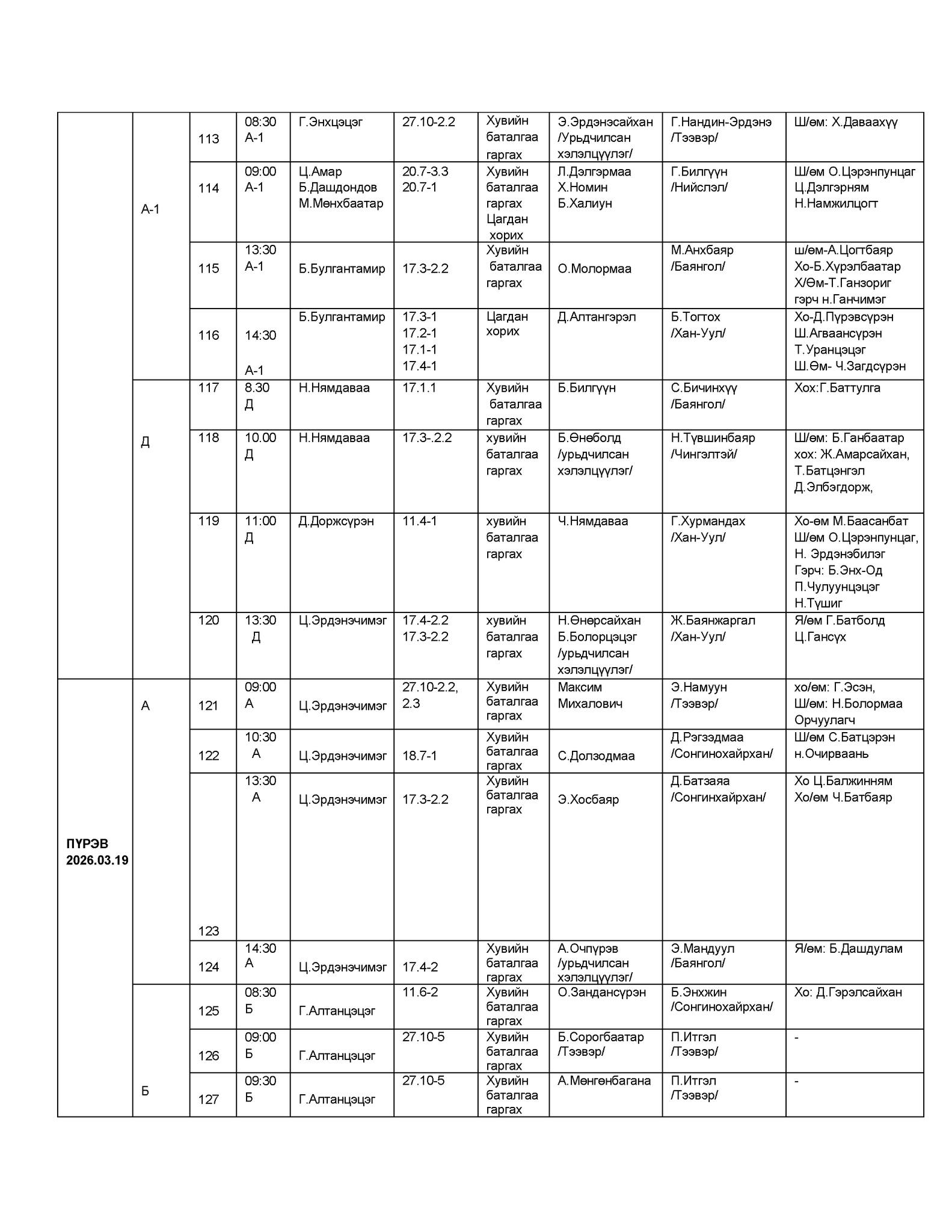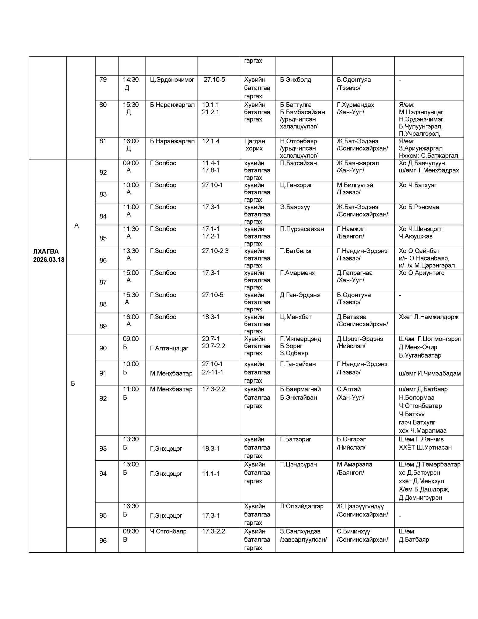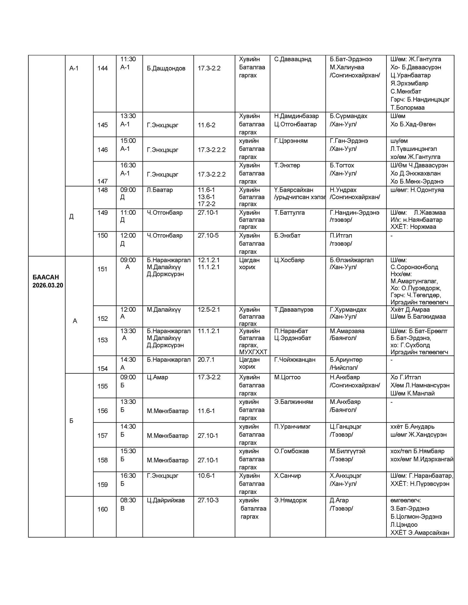 - БАЯНГОЛ, ХАН-УУЛ, СОНГИНОХАЙРХАН ДҮҮРГИЙН ЭРҮҮГИЙН ХЭРГИЙН АНХАН ШАТНЫ ТОЙРГИЙН ШҮҮХИЙН ШҮҮХ ХУРАЛДААНЫ ЗАР /2026.03.16-03.20/
