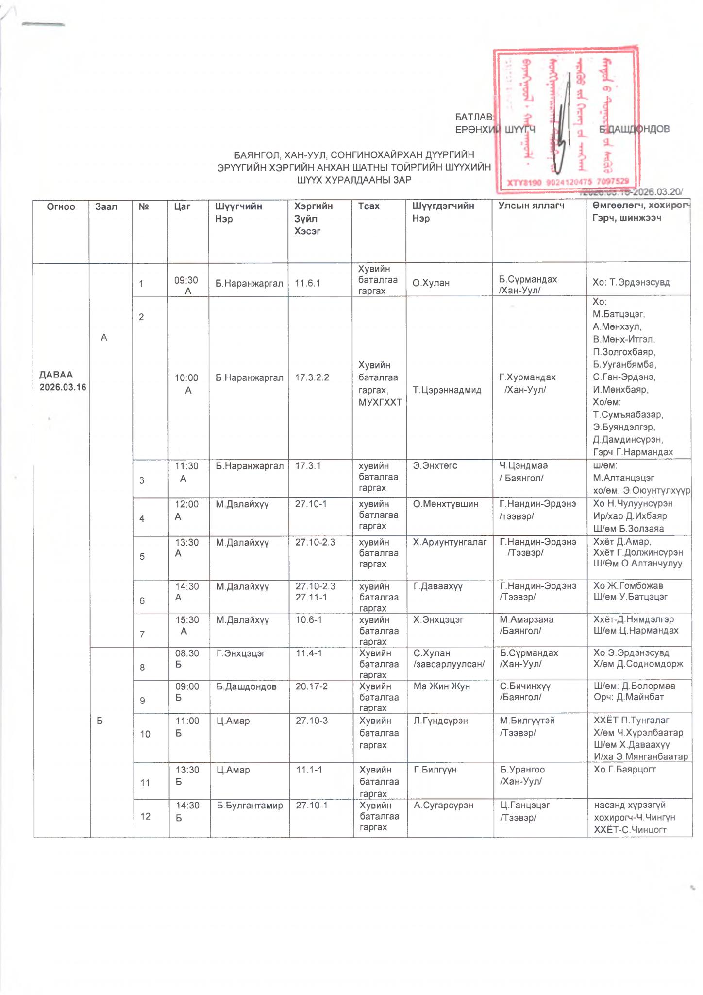 БАЯНГОЛ, ХАН-УУЛ, СОНГИНОХАЙРХАН ДҮҮРГИЙН ЭРҮҮГИЙН ХЭРГИЙН АНХАН ШАТНЫ ТОЙРГИЙН ШҮҮХИЙН ШҮҮХ ХУРАЛДААНЫ ЗАР /2026.03.16-03.20/