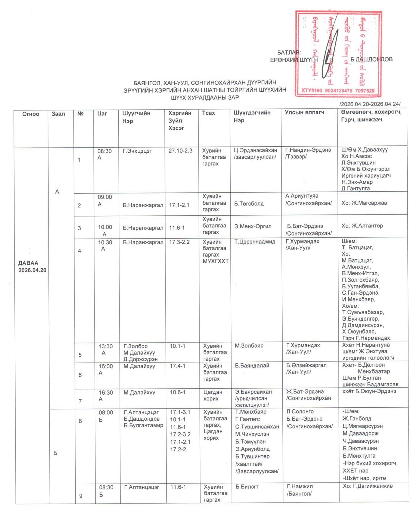 БАЯНГОЛ, ХАН-УУЛ, СОНГИНОХАЙРХАН ДҮҮРГИЙН ЭРҮҮГИЙН ХЭРГИЙН АНХАН ШАТНЫ ТОЙРГИЙН ШҮҮХИЙН ШҮҮХ ХУРАЛДААНЫ ЗАР /2026.04.20-04.24/